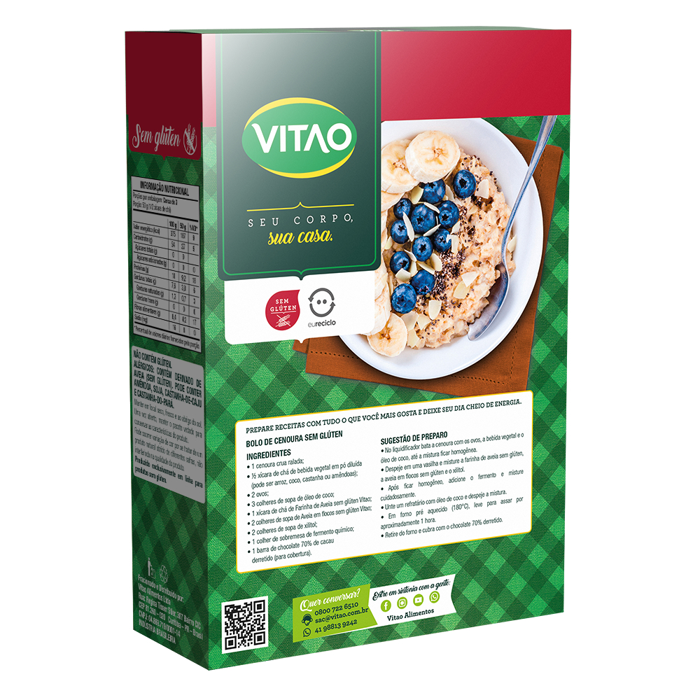 A Farinha de Aveia Sem Glúten Vitao é indicada para quem busca uma opção saudável para substituir farinhas refinadas em receitas. Ideal para quem segue uma dieta sem glúten, ela contribui para o controle glicêmico e oferece saciedade prolongada. É Fonte de fibras, auxiliando no funcionamento intestinal, no peso, além de dar saciedade e ser rica em vitaminas e minerais. Pode ser consumida tanto "in natura", como também pode ser adicionada a iogurtes, sucos, vitaminas, sopas, frutas, farofas, preparações como pães e bolos e até mesmo como substituto da farinha de rosca para empanar. BOLO DE CENOURA SEM GLÚTEN INGREDIENTES: • 1 cenoura crua ralada; • ½ xícara de chá de bebida vegetal em pó diluída (pode ser arroz, coco, castanha ou amêndoas); • 2 ovos; • 3 colheres de sopa de óleo de coco; • 1 xícara de chá de Farinha de Aveia sem glúten Vitao; • 2 colheres de sopa de Aveia em flocos sem glúten Vitao; • 2 colheres de sopa de xilitol; • 1 colher de sobremesa de fermento químico; • 1 barra de chocolate 70% de cacau derretido (para cobertura). SUGESTÃO DE PREPARO: • No liquidificador bata a cenoura com os ovos, a bebida vegetal e o óleo de coco, até a mistura ficar homogênea. • Despeje em uma vasilha e misture a farinha de aveia sem glúten, a aveia em flocos sem glúten e o xilitol. • Após ficar homogêneo, adicione o fermento e misture cuidadosamente. • Unte um refratário com óleo de coco e despeje a mistura. • Em forno pré aquecido (180°C), leve para assar por aproximadamente 1 hora. • Retire do forno e cubra com o chocolate 70% derretido. INGREDIENTES: Farinha de aveia sem glúten. ALÉRGICOS: CONTÉM DERIVADO DE AVEIA (SEM GLÚTEN). PODE CONTER AMÊNDOA, SOJA, CASTANHA-DE-CAJU E CASTANHA-DO-PARÁ. NÃO CONTÉM GLÚTEN. INTEGRAL, SEM GLÚTEN, FONTE DE FIBRAS.