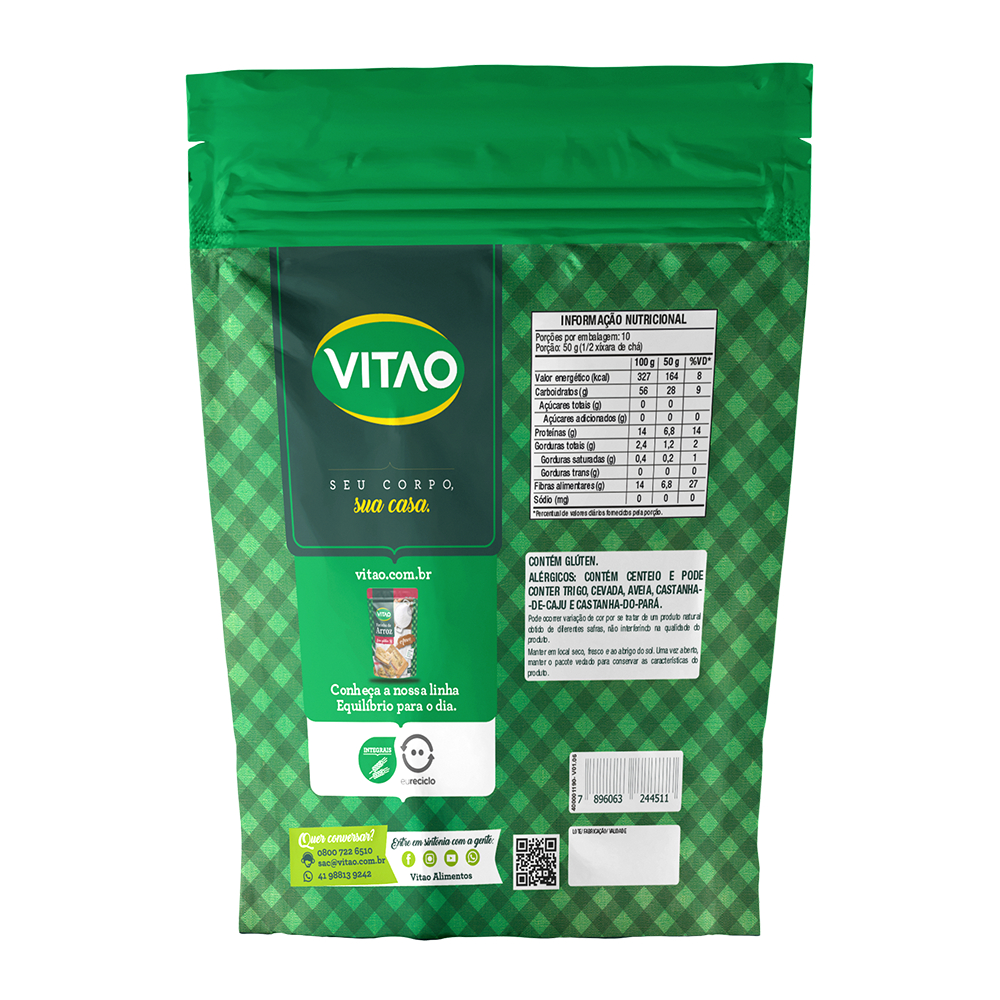 A farinha de centeio da Vitao é um ingrediente versátil e nutritivo, ideal para adicionar sabor e valor nutricional às suas receitas. Feita a partir dos grãos de centeio selecionados, essa farinha possui um sabor característico e uma textura levemente densa. Além disso, o centeio é conhecido por sua capacidade de fornecer energia sustentada e auxiliar na regulação dos níveis de açúcar no sangue. Experimente a farinha de centeio da Vitao e aproveite todos os benefícios desse grão nutritivo em suas preparações culinárias. Rica em fibras, vitaminas e minerais, a farinha de centeio é uma excelente opção para o preparo de pães, bolos, biscoitos e outras receitas. INGREDIENTES: Farinha de Centeio. ALÉRGICOS: CONTÉM CENTEIO E PODE CONTER TRIGO, CEVADA, AVEIA, CASTANHA-DE-CAJU E CASTANHA-DO-PARÁ. CONTÉM GLÚTEN. INTEGRAL, RICO EM FIBRAS.