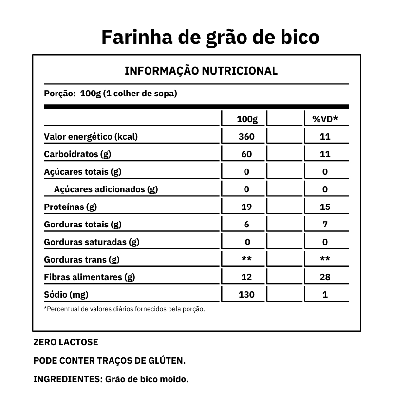 Farinha de Grão-de-Bico — Versátil e nutritiva, é ideal para o preparo de massas, bolos, pães e panquecas. Possui sabor leve e textura fina, garantindo receitas com excelente consistência e um toque especial no sabor. Ingredientes: Grão de bico moido. ALÉRGICOS: PODE CONTER TRAÇOS DE GLÚTEN, LEITE, SOJA, AMENDOIM E CACAU POR CONTAMINAÇÃO CRUZADA. INFORMAÇÕES ADICIONAIS - PODE HAVER VARIAÇÃO DE COR DEPENDENDO DO LOTE. - EMBALAGEM MERAMENTE ILUSTRATIVA.