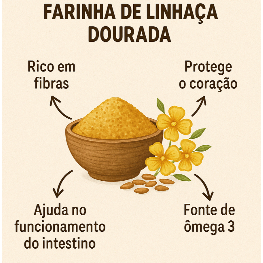 A farinha de linhaça dourada é um alimento versátil e nutritivo, obtido a partir da moagem das sementes de linhaça dourada. Rica em fibras e fonte natural de ômega 3, ela pode ser uma excelente aliada em uma alimentação equilibrada. Com sabor suave, é ideal para adicionar em vitaminas, iogurtes, frutas, pães, bolos e receitas diversas. ✅ Sem glúten ✅ Fonte de fibras ✅ Não contém conservantes ✅ Produto natural Incorpore mais saúde à sua rotina de forma simples e saborosa!