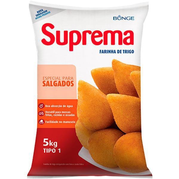 Farinha de Trigo Especial para Salgados Suprema Bunge 5kg: Especialmente desenvolvida para a confecção de salgados como coxinhas, croquetes e bolinha de queijo, garantindo alto rendimento e qualidade do produto final.