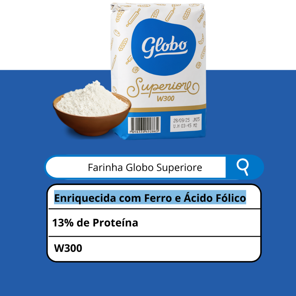 * imagens ilustrativas* A Farinha Globo Superior W300 é a escolha ideal para quem busca máxima qualidade, força e estabilidade nas receitas. Produzida com matéria-prima selecionada, é uma farinha tipo superior, desenvolvida especialmente para preparos que exigem maior elasticidade, estrutura e crescimento uniforme. Com força W300, essa farinha se destaca pela excelente capacidade de absorção de água, desenvolvimento de glúten e performance profissional, garantindo resultados finais muito mais leves, altos e macios. Ela é ideal tanto para padarias quanto para uso doméstico de quem ama panificação de qualidade. Desenvolvida com alta força (W300) para receitas exigentes. Proporciona massa elástica e resistente, perfeita para longas fermentações. Ajuda a obter pães volumosos, crocantes por fora e macios por dentro. Qualidade constante que traz padronização para produção diária. Indicada para processos artesanais e industriais. Combinando tecnologia, pureza e qualidade premium, a Farinha Globo W300 garante que suas receitas alcancem um padrão profissional, com textura, maciez e crescimento excepcionais. Seja para vender ou para uso pessoal, essa farinha entrega resultado superior em cada fornada.