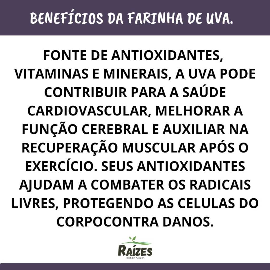 Farinha de Uva Como é feita a Farinha de Uva? A farinha de uva é constituída a partir do processamento das frutas inteiras. Devido esse procedimento (açúcares) são reduzidos, já os minerais e fibras tem a concentração aumentada, por serem mais resistente. Benefícios da Farinha de Uva: Por conta da farinha de uva ter um aumento em sua quantidade de fibras solúveis, grande responsável pelo consumo regular deste produto pode auxiliar na digestão diária dos alimentos. quando consumida cerca de 30 minutos antes das grandes refeições (ou seja, almoço e jantar), cria a sensação no estomago, dilatando-o e enganando-o. Sugestão de Uso da Farinha de Uva A sugestão é utilizar de 1 a 2 colheres de sopa de Farinha de Uva para o preparo de batidas, vitaminas, doces, etc.
