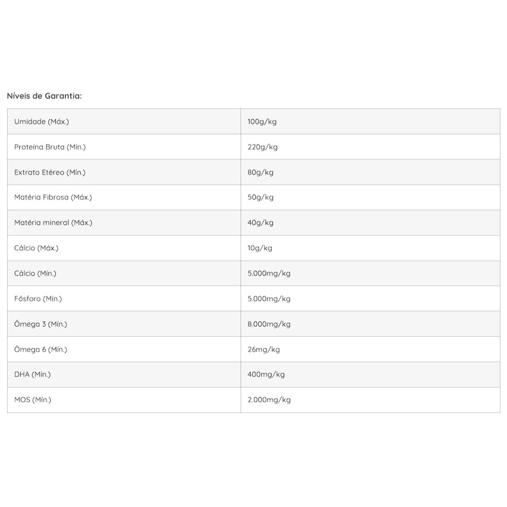 Descrição: A Nutribiótica para Criadores Farinhada Egg Protein Psitacídeos é um alimento completo e balanceado para Psitacídeos durante o período de manutenção e reprodução. Composição Básica: Milho Moído*, Farelo de Soja**, Farinha de Trigo, Arroz Integral Floculado, Proteína Texturizada de Soja, Farelo de Soja Micronizada**, Alho Desidratado (0,4%), Ovo em pó, Óleo de Soja refinado**, Mel de Abelha, Semente de Níger, Grão de Girassol, Cloreto de Sódio, Prebióticos (Frutooligossacarídeo-FOS e Mananoligossacarídeo-MOS), Ácido Fólico, D-Pantotenato de Cálcio, Biotina, Vitamina C, Niacina, Cloreto de Colina, Vitamina A, Vitamina B1 (Tiamina), Vitamina B2 (Riboflavina), Vitamina B6 (Piridoxina), Vitamina B12, Vitamina D3, Vitamina E, Vitamina K3 (Menadiona), Inositol, Ferro Quelato, Cobre Quelato, Iodato de Cálcio, Sulfato de Cobalto, Sulfato de Manganês, Manganês Quelatado, Zinco Quelatado, Selênio Quelatado, Picolinato de Cromo, Calcário Calcítico, Fosfato Bicálcico, Lisina, DL-Metionina, Sorbato de Potássio, Dióxido de Silício, Ácido Cítrico, BHT, BHA, Aroma de Melaço, Aroma de Abacaxi. Espécies doadoras de genes: *Streptomyces viridochromogenes, Bacillus thuringiensis. **Agrobacterium tumefaciens. Ingredientes fixos sem eventuais substitutivos. Níveis de Garantia: Umidade (Máx.) 100g/kg. Proteína Bruta (Mín.) 220g/kg. Extrato Etéreo (Mín.) 30g/kg. Matéria Fibrosa (Máx.) 45g/kg. Matéria mineral (Máx.) 50g/kg. Cálcio (Máx.) 6.000mg/kg. Cálcio (Mín.) 4.000mg/kg. Fósforo (Mín.) 2.000mg/kg. Ômega 3 (Mín.) 100mg/kg. Ômega 6 (Mín.) 18g/kg. MOS (Mín.) 1000mg/kg. FOS (Mín.) 1000mg/kg. Modo de uso e conservação: Fornecer como única fonte de alimentação. Podem ser oferecidos sementes, frutas, legumes e verduras como enriquecimento ambiental, desde que não ultrapasse 20% do total diário consumido. O alimento Nutribiótica Farinhada Egg Protein Psitacídeos deve estar sempre disponível em comedouros limpos e secos. É recomendável um período de adaptação de 4 a 8 semanas ao fornecer o novo alimento pela primeira vez e observar se o animal realmente está bem adaptado antes da substituição total. Consulte um médico veterinário ou zootecnista regularmente. Conservar em local seco e arejado, ao abrigo da luz e na embalagem original. Após aberto, manter a embalagem bem fechada e ao abrigo de luz solar e umidade. Enriquecimento por kg: Vitamina A (Mín.) 19.000UI, Vitamina D3 (Mín.) 2000UI, Vitamina E (Mín.) 260UI, Vitamina C (Mín.) 140mg, Vitamina B1 (Mín.) 8,0mg, Vitamina B2 (Mín.) 13,0mg, Vitamina B6 (Mín.) 13,0mg, Vitamina B12 (Mín.) 50,0mcg, Vitamina K3 (Mín.) 5,0mg, Ácido Fólico (Mín.) 4,0mg, Ácido Pantotênico (Mín.) 68,0mg, Biotina (Mín.) 0,65mg, Niacina (Mín.) 120,0mg, Colina (Mín.) 800,0mg, Inositol (Mín.) 250mg, Cobre quelatado (Mín.) 17,0mg, Ferro quelatado (Mín.) 6,6mg, Iodo (Mín.) 860mg, Manganês (Mín.) 61,0mg, Manganês quelatado (Mín.) 13,3mg, Selênio quelatado (Mín.) 0,266mg, Zinco quelatado (Mín.) 66,6mg, BHT (Mín.) 125mg, BHA (Mín.) 125mg, Cobalto (Mín.) 0,13mg, Cromo (Mín.) 0,16mg.
