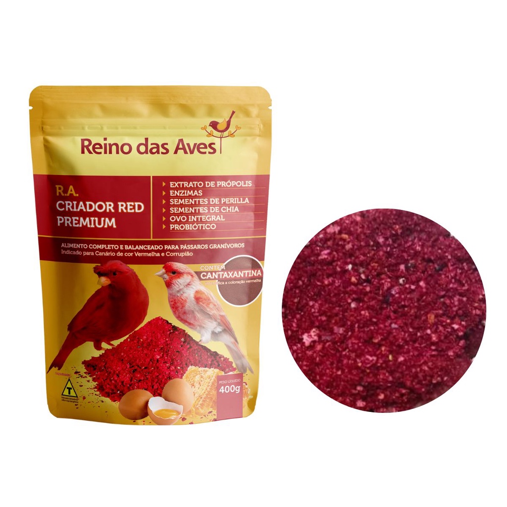 RA Criador Red Premium 400g - Reino das Aves Alimento completo e balanceado para pássaros granívoros, indicado para canário de cor vermelha e corrupião. Composição Básica: Milho Pré-Gelatinazado(1), Dextrose, Farelo de Soja(2), Ovo Integral Desidratado (mín. 1,0%), Aveia sem casca, Linhaça, Níger, Perilla (mín. 0,1%), Trigo Grão, Chia (mín. 0,2%), Cantaxantina (mín. 015%), Beterraba desidratada, Sal comum, Extrato de Levedura, Farinha de Ostra, Enzimas (mín. 0,15% – Mistura de Pectinase, Protease, Fitase, Betaglucanase, Xilanase, Celulase e Amilase), Vitamina A, Vitamina C, Vitamina D, Vitamina E, Vitamina K, Vitamina B1, Vitamina B2, Vitamina B6, Vitamina B12, Niacina, Ácido Pantotênico, Ácido Fólico, Biotina, Sulfato de Ferro, Sulfato de Cobre, Óxido de Zinco, Sulfato de Manganês, Iodato de Cálcio, Selenito de Sódio, Aditivo Probiótico, Aditivo Antifúngico (Ácido Propiônico), Aroma de Leite com Frutas. Modo de Uso: Fornecer em comedouro apropriado e limpo. Pode ser fornecido também misturado com água mas, neste caso o comedouro deve ser troado diariamente. Modo de Conservação Conservar em local fresco e seco, ao abrigo da luz solar.