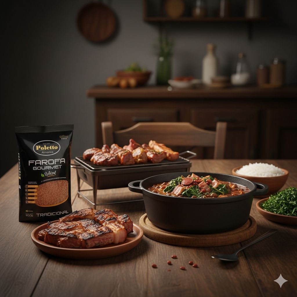 Farofa Gourmet Poletto CHURRASCO 300g A Farofa Gourmet Poletto é uma farofa caseira, crocante e artesanal, com textura e sabor incomparáveis. Produzida de forma cuidadosa, entrega o verdadeiro sabor mineiro, tornando-se o acompanhamento ideal para churrasco, feijoada ou refeições do dia a dia. O produto já vem pronto para servir, oferecendo praticidade sem abrir mão do sabor. Benefícios Farofa caseira e artesanal Textura crocante Sabor tradicional mineiro Ideal para churrasco, feijoada e refeições diárias Produto pronto para servir Embalagem prática de 300g Informações do Produto Marca: Poletto Alimentos Produto: Farofa Gourmet Peso líquido: 300g Textura: Crocante Consumo: Pronta para servir Ingredientes Farinha de mandioca, gordura vegetal, proteína de soja, alho, cebola, salsinha e sal, BHT e EDTA. Informações Importantes Não contém glúten. Alérgicos: contém derivados de soja. Validade: 6 meses. Perguntas Frequentes A farofa já vem pronta para consumo? Sim, o produto é pronto para servir. Ela é crocante? Sim, possui textura crocante e sabor marcante. Combina com quais pratos? Ideal para churrasco, feijoada e refeições do dia a dia. Contém glúten? Não. O produto não contém glúten. Qual a validade do produto? A validade é de 6 meses.