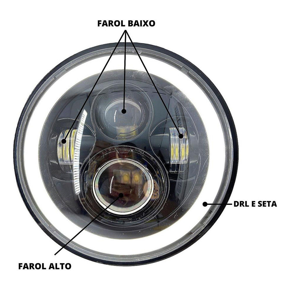 *COMPATIVEL COM TODOS OS MODELOS DE CAMINHÃO, CARROS E MOTOS QUE TENHAM FAROL REDONDO 7 POLEGADAS* Nosso farol de 7” polegadas, além da alta eficiência de iluminação por possuir farol baixo e farol alto, conta com visual arrojado e inovador, tendo o “circulo” em led em volta do farol, chamado também de Angel Eyes e DRL, e ao acionar a SETA, esse circulo piscará na cor Âmbar (laranja). CARACTERISTICAS: Tamanho: 7 Polegadas - 18cm Potência luz alta (und): 60W / 7200 Lumens Potência luz baixa (par): 40W / 3600 Lumens Tipo de luz: Alta, baixa, seta, DRL/diurna Chip de LED: CREE - Americano Temperatura da cor: 6000-6500K Resistente à água: IP68 Tensão de operação: 10-30V DC Material: Alumínio injetado alta qualidade Material da lente: Policarbonato (Não trinca com choque térmico) Cor do angel eyes: Branco para luz diurna, âmbar para pisca Vida útil estimada: 35.000 Horas Consumo (12V): Luz baixa 2.0A / Luz alta 3.0A Consumo (24V): Luz baixa 1.0A / Luz alta 1.8A Certificações: CE, RoHS Engates: H4 MEDIDAS: Largura total: ±18cm Profundidade: 8cm INSTALAÇÃO: Fácil adaptação, pois já possui plug H4 e H13 ITENS INCLUSOS 01 Faról Angel Eyes *NÃO ACOMPANHA SUPORTE** APLICAÇÃO FUSCA, KOMBI, JEEP, WRANGLER, CAMINHAO