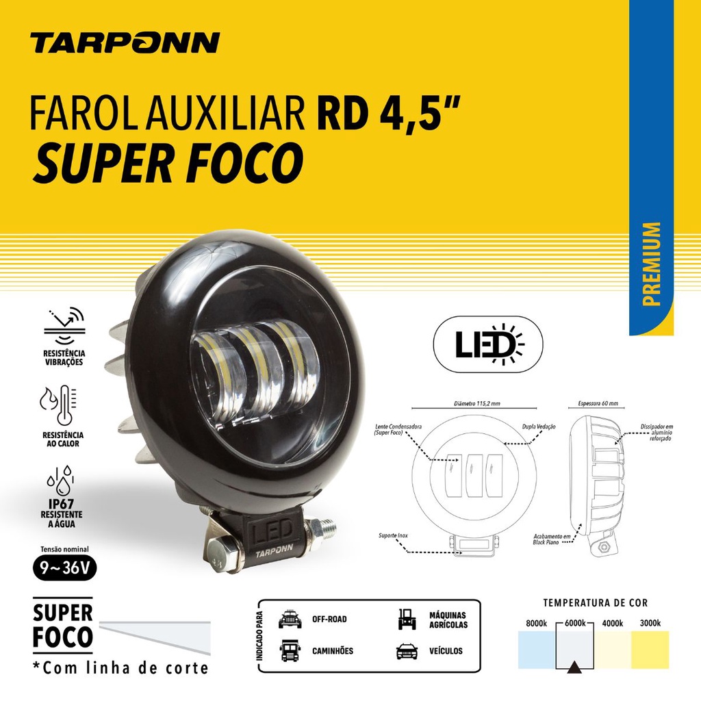 PRODUTO A PRONTA ENTREGA, COM ENVIO IMEDIATO E NOTA FISCAL! Você não precisa escolher entre qualidade e economia. Com um ótimo custo-benefício, o Farol Auxiliar Milha da Linha Premium da Tarponn tem um super foco, iluminação superior e baixo consumo de energia,, sem comprometer a bateria do seu veículo. Acabamento em Black piano é um dos diferenciais do Farol Auxiliar RD 4,5”. Esse acabamento é obtido através de um processo de pintura que utiliza várias camadas de tinta preta brilhante e um polimento cuidadoso, resultando em uma superfície lisa e reflexiva, semelhante ao acabamento de um piano. Esse processo de acabamento agrega valor estético ao produto, tornando-o ainda mais atrativo e sofisticado. CARACTERÍSTICAS: · Vedação Dupla · Suporte Inox · Dissipador em Alumínio Reforçado · Baixo Consumo de Energia · Super foco · Resistência Vibrações · Resistente a Água · Resistência ao Calor FICHA TÉCNICA: · Cor: Branca Fria · Temperatura de Cor: 6000K · Encaixe: Universal · Tensão: 9V a 36V · Lente: Condensadora (Super Foco) · Tipo de LED: CREE · Linha: Premium · Grau de proteção de água: IP67 CONTEÚDO EMBALAGEM: · 1 Farol Auxiliar RD Super Foco Mega GT - Especialista em Acessórios Automotivos e Utilidades Na Mega GT, somos especialistas em Acessórios Automotivos e Utilidades. Buscamos sempre oferecer a melhor opção com preço justo em todas as suas compras. Todos os produtos: • São Produtos Originais • Acompanham Nota Fiscal • Envio em Até 24 Horas • 1 Ano de Garantia DÚVIDAS FREQUENTES: • Os produtos são originais? Sim, todos os nossos produtos são originais e de alta qualidade. • Temos pronta entrega? Sim, todos os nossos produtos estão disponíveis em estoque para envio imediato. Despachamos em até 24 horas. • Emitem nota fiscal? Sim, todos os nossos produtos acompanham nota fiscal, garantindo a sua segurança e a conformidade nas transações comerciais. • Possui garantia? Sim, os nossos produtos Premium possuem garantia de 1 Ano. A sua satisfação é a nossa prioridade. *Imagens meramente ilustrativas