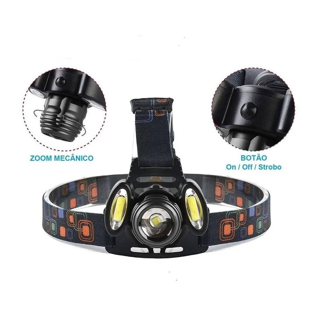 Farol Lanterna Bike 3 Focos Led Com Zoom Recarregável Ciclismo Pesca Trilha Cabeça