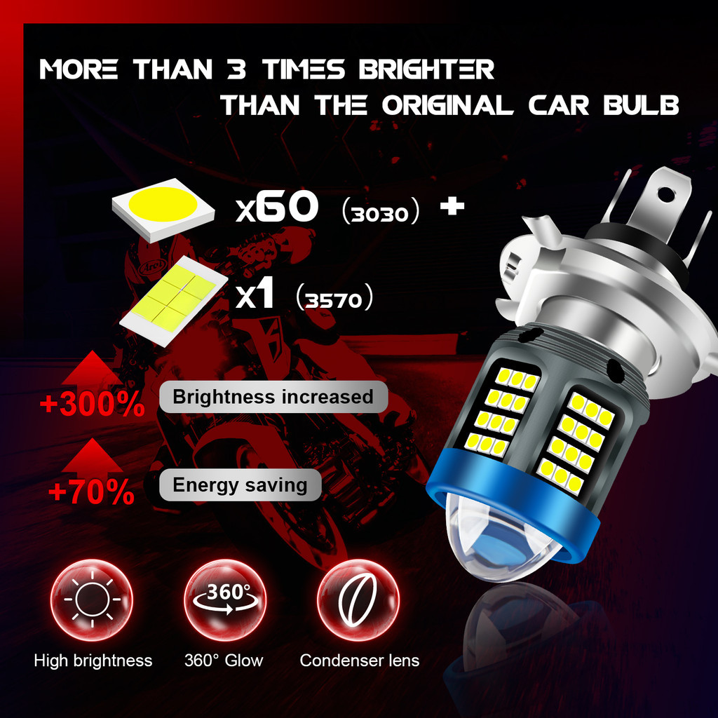 Descrição】 Faça sua noite mais brilhante: 1 Faça sua noite mais brilhante: Nossa luz LED está equipada com 66 chips LED. A temperatura de cor da luz forte é de 6000K luz branca e luz amarela 3000K, torne sua condução mais confortável. Chip de alto desempenho de alta Performance Chip LED de alta qualidade 3570 de alta qualidade, lúmens de até 3000 LM, irradiação de brilho, alto brilho. Brilho largo +300% de brilho Alta performance: A carcaça de alumínio fundido pode suportar ambientes agressivos, com força e durabilidade. A lente bifocal atualizada design especial de forma bifocal, pode ajudar a refratar e focar a luz e melhorar significativamente o efeito de foco. e são adequados para ambientes agressivos. Dissipação de calor melhor de 4 4: Para obter o melhor efeito de dissipação de calor, nossa barra de luz LED adota liga de alumínio de aviação como concha, que pode alcançar a melhor dissipação de calor e a melhor vedação de calor. A vida útil da barra de luz em mais de 50.000 horas. ESPECIFICAÇÃO】 Número do LED: LED 66 PCS Tipo de soquete: H4,H6/BA20D,P15D Tensão de tensão: DC 12V-80V Potência de energia: 11W Fluxo Lumens: 3000LM Chips LED Chips: 3030 Chips LED Chip + 3570 LED Chip: 3030 Chip LED + 3570 Chip LED Ângulo de luz da luz: 360° Temperatura de cor: 3000K&6000K Temperatura Ambiental: -40℃~ 85℃ Liga de alumínio Incluído no Pacote】 Farol LED para motocicleta 1PCS
