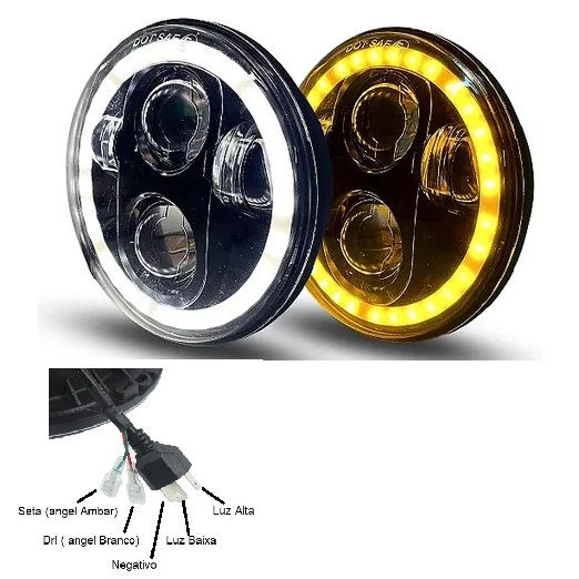 Faróis redondo 5,75 polegadas (146mm de diametro) Corpo de Alumínio À prova d' água: IP67 Temperatura de cor: 6000 K (Branco) Tensão de funcionamento: DC 10-30 V Farol alto: 40w (3500lumens) Farol baixo: 20w (2200lumens) Angel Eyes: Branco DRL e Laranja SETA ( Necessidade de adaptação, Relé 5 pinos) Ideal para adaptar em carros, motos, trator, Buggy, gaiola, jeeps, carretas, caminhões e guinchos. Produto de altíssima qualidade, iluminação led. COMPATÍVEL: BUGGYS BRM M11, BRASILIA, TL, VARIANT, PASSAT, SULTAN, NEW BOOG CAMINHÕES 1620, Atron, Atego, Accelo, Ford, Volks e outros com farol redondo medida 146mm de diametro MOTOS Suzuki, HL Dyna, e demais com faróis 5,75 polegadas. Triunth Thunderbird, Rocket, Roadster, Escudeiro Indiano, Indian Scout. Conteúdo: Opção 1: 01 peça de farol 5,75 leds Opção 2: 02 peças de farol 5,75 leds Opção 3: 04 peças de farol 5,75 leds