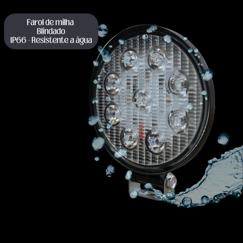 Farol Milha 12v 27w 9 led Branco frio 6500k Redondo IP66 Caminhonete Van Ônibus Caminhão Carro