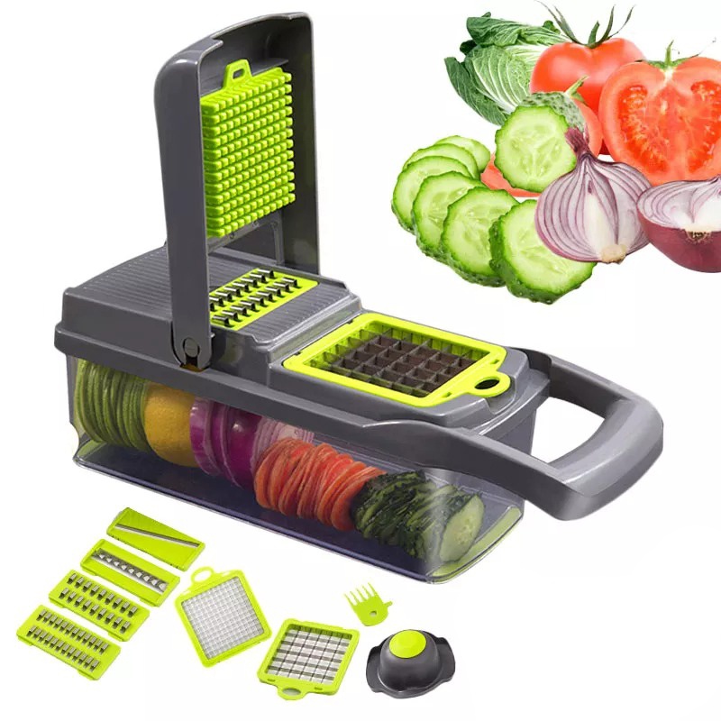 Fatiador Cortador Ralador e Descascador De Alimentos de Legumes Frutas Nicer Multifuncional com 7 tipos de lâminas, perfeito para fatiar, espremer, cortar, triturar,... Moldes para fatiado e cortador em cubos, além disso você consegue obter uma fatia fina ou grossa, grandes ou pequenos cubos facilmente e rapidamente; Pode ser facilmente desmontável e fácil de lavar depois do uso; É só mudar as lâminas e pressionar para diferentes cortes em vegetais ou frutas, muito fácil de operar, ajuda você a cozinhar melhor e mais rápido, ótimo aproveitamento de tempo e economia de energia! Acompanha nada menos que 13 acessórios! São eles: 1) Cortador anatômico na cor grafite 2) Vasilha em acrílico com base antiderrapante em silicone 3) Escorredor de alimentos 4) Lâmina de corte em inox 14x14mm 5) Lâmina de corte em inox 7x7 mm 6) Lâmina de corte em rodelas 2mm de fatia 7) Lâmina de ralador 8) Lâmina de corte ondulado de batatas e legumes 9) Lâmina de corte Julienne 4mm 10) Lâmina de corte Julienne 3mm 11) Protetor de mãos 12) Escovinha de limpeza do cortador 13) Separador de clara e gema