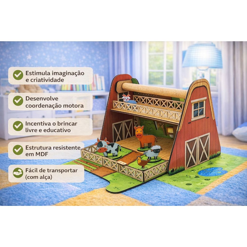 🧠 Brinquedo Educativo em Madeira – Fazendinha Infantil Encante as crianças com essa linda Fazendinha de Madeira, perfeita para estimular a imaginação, criatividade e o aprendizado desde cedo. Um brinquedo educativo, resistente e colorido, ideal para brincar e aprender ao mesmo tempo. ✨ Destaques do Produto: ✔ Produzido em madeira resistente e durável ✔ Estilo Montessori, estimula coordenação motora e raciocínio ✔ Acompanha animais ✔ Design colorido e divertido ✔ Ideal para brincadeiras educativas e interativas 🐮 Animais inclusos: Vaca, cavalo, porco, ovelha, galinha, galo, pato, cachorro e cabra 🎁 Excelente opção de presente para aniversários, Natal, Dia das Crianças ou uso pedagógico. 📏 DIMENSÕES ALTURA: 20 CM LARGURA: 23 CM COMPRIMENTO: 18 CM ( fechado ) 53 CM ( aberto ) ⚠️ ENVIADO EM EMBALAGEM DE MADEIRA ✔ Garantia no transporte ⚠️ Recomendado para crianças a partir de 3 anos