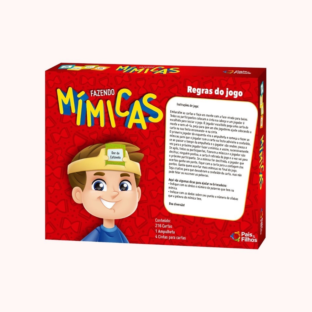 Fazendo Mímicas Pais & Filhos Que melhor maneira de passar uma tarde chuvosa do que com um jogo de mesa ? Com o fazendo mimicas você vai criar lembranças divertidas e passar momentos inesquecíveis com os seus amigos. Com este passatempo divertido as risadas estão garantidas. Idade recomendada: a partir de 8 anos.