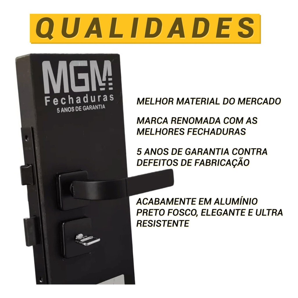 A Fechadura da MGM é um luxo de produto uma das melhores do mercado nesse segmento. Feito em acabamento de excelente qualidade, trinco reversível para instalação em portas que abram para direita e esquerda, compatível com modelos existentes no mercado, maçaneta em alumínio, roseta em aço inoxidável e haste maciça com parafuso.