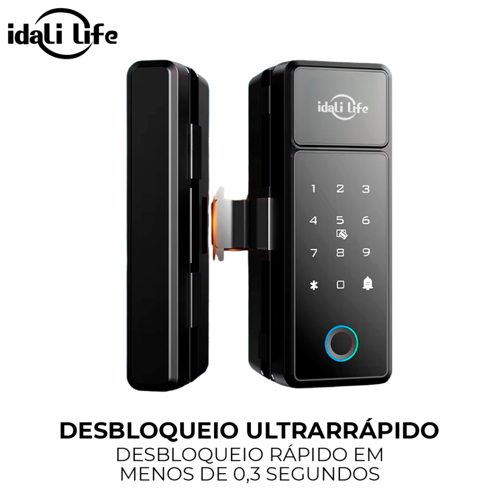 Fechadura Digital Inteligente para Porta de Vidro IDALI LIFE | Biometria + Senha + Cartão + Bluetooth + App Segurança e tecnologia para sua casa ou escritório A Fechadura Inteligente IDALI LIFE combina segurança avançada, design moderno e múltiplas formas de acesso, sendo ideal para portas de vidro, portas de madeira leve, portas deslizantes e portas com moldura de alumínio. Equipada com sensor biométrico semicondutor de alta precisão, permite desbloqueio rápido em menos de 0,3 segundos, garantindo praticidade e proteção no dia a dia. Seu sistema oferece diversas formas de abertura, proporcionando mais comodidade e controle de acesso para residências, escritórios, consultórios e empresas. Formas de Desbloqueio Impressão digital (biometria) Senha numérica Cartão magnético Controle remoto Bluetooth NFC Aplicativo Principais Vantagens Reconhecimento rápido em menos de 0,3 segundos Armazena até 100 impressões digitais Até 1000 combinações de acesso (senha + cartão + controle) Trava com gancho duplo para maior segurança Design moderno e elegante Instalação prática Compatível com portas de vidro e outros modelos Especificações Técnicas Marca: IDALI LIFE Material: Liga de alumínio e zinco Sensor: Biometria semicondutora Capacidade de digitais: 100 usuários Velocidade de reconhecimento: < 0,3 segundos Tipo de cartão: M1 / IC (2ª geração) Alimentação: 4 pilhas AAA 1.5V Fonte de energia de emergência: Interface Android Temperatura de funcionamento: -20°C a 60°C Peso: 1,5 kg Compatibilidade de Portas Porta de vidro Porta com moldura de alumínio Porta de madeira leve Porta deslizante Folga da porta sem moldura: 5–12 mm Abertura: Direita ou esquerda (reversível) Conteúdo da Embalagem 1x Fechadura digital inteligente 1x Macaneta 2x Cartões de acesso 2x Chaves Manual do usuário Kit de instalação Cuidados: - Manutenção Regular: Verifique periodicamente as baterias e o funcionamento do mecanismo. - Proteção contra Umidade: Evite expor a fechadura a ambientes excessivamente úmidos para garantir seu funcionamento adequado. - Utilização Adequada: Siga as instruções do manual para a instalação e uso, evitando danos ao produto. Observações Importantes Utilize pilhas AAA para melhor desempenho. Recomenda-se instalação seguindo o manual para funcionamento correto.