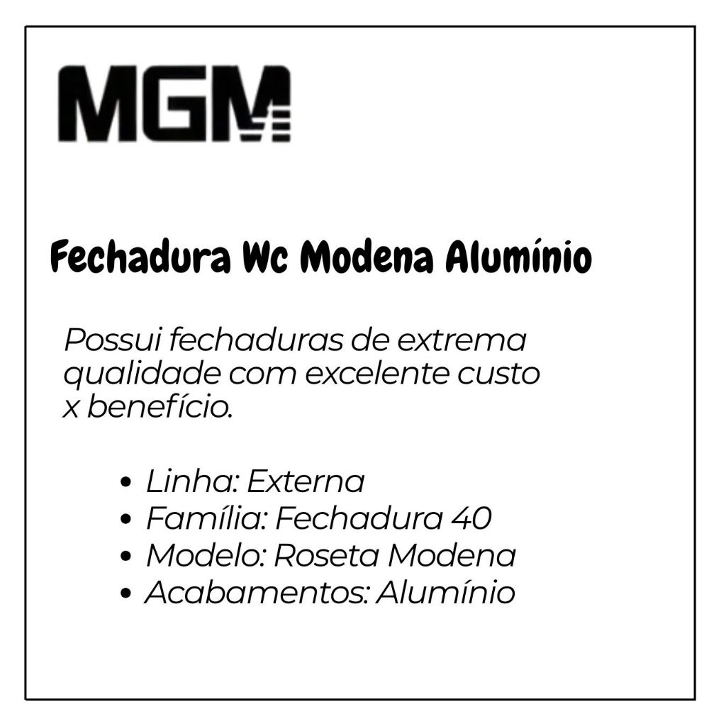 FECHADURA PORTA QUARTO SALA BANHEIRO(WC) MODENA ALUMÍNIO MGMFECHADURA BROCA 40 MM.1 x FECHADURA 40 ROSETA MÓDENA ALUMÍNIODescriçãoA MGM é uma das maiores fabricantes de produtos para construção civil da América Latina. Possui fechaduras de extrema qualidade com excelente custo x benefício.Linha: Externa (todas as aplicações), Interna (quarto - interior), Banheiro (WC) - (Por favor selecionar)Família: Fechadura 40Modelo: Roseta ModenaAcabamentos: AlumínioTipo da Maçaneta: Alavanca Injetada em AlumínioTipo do Espelho: Roseta Estampado em AçoDistância de Broca: 40 mmFixação: Parafusos (acompanha o produto) para portas de madeira e rebites para portas de metal (não acompanha).Máquina: em Aço 40 mm.Trinco: Reversível (D/E) Injetado em ZamacLingueta: Injetado em ZamacCilindro: Injetado em AlumínioChaves: LatãoAplicação: Portas externas e internas para madeira e aço.De acordo com as normas ABNT NBR 14913/2011Empresa certificada ISO 9001/2015Conteúdo:1 Máquina Externa1 Conjunto de Maçaneta1 Conjunto de Roseta1 Conjunto de Parafusos1 Contra-Testa1 Cilindro1 Conjunto de Chaves
