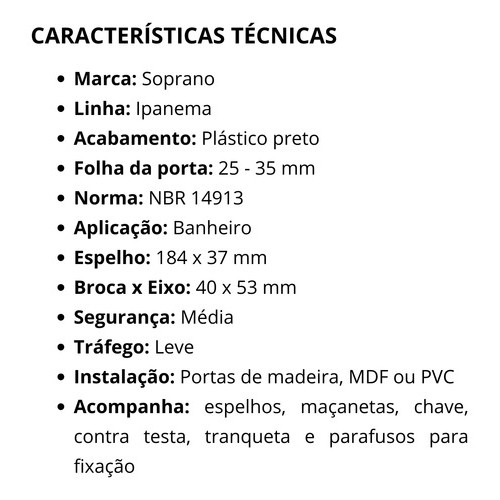 >> LEIA COM ATENÇÃO: O anúncio diz respeito a 1 ( UMA ) Fechadura Banheiro Ipanema Reta (40x53) Preta Soprano A Fechadura Ipanema Alavanca Reta Banheiro Preta da Soprano é a escolha ideal para quem busca segurança, durabilidade e um design moderno para o banheiro. Fabricada com materiais de alta qualidade, esta fechadura garante resistência e uma longa vida útil, mesmo sob uso constante. Seu acabamento preto fosco oferece um toque sofisticado que complementa qualquer decoração, tornando-se uma peça chave para um ambiente elegante. A Fechadura Ipanema foi desenvolvida para proporcionar máxima segurança e privacidade no banheiro, características essenciais para o conforto de sua família. A alavanca reta ergonomicamente desenhada facilita o uso diário, enquanto o acabamento durável mantém sua aparência impecável por muito mais tempo. Invista na segurança e no estilo do seu banheiro com a fechadura que combina praticidade, beleza e durabilidade. >> BENEFÍCIOS: - Longa durabilidade e resistência - Design moderno e sofisticado - Fácil instalação e uso - Segurança garantida para seu banheiro - Qualidade assegurada pela marca Soprano >> ESPECIFICAÇÕES TÉCNICAS: - Norma: ABNT NBR 14913 - Marca: Soprano - Modelo: Ipanema Alavanca Reta Banheiro - Acabamento: Termoplástico preto fosco - Quantidade de Chaves: Acompanha uma chave fixa por dentro da porta e chave reserva para ser usada por fora em caso de necessidade - Broca e Eixo: 40 mm - Aplicação: Portas de banheiro - Espessura Recomendada da Porta: 30 a 40 mm >> O QUE VOCÊ RECEBE EM SUA CASA: 1 Fechadura Banheiro Ipanema Reta (40x53) Preta Soprano >> PERGUNTAS E RESPOSTAS: - Essa fechadura é compatível com qualquer porta de banheiro? R: Sim, ela é compatível com portas de banheiro com espessura entre 30 e 40 mm. - O acabamento preto desbota com o tempo? R: O acabamento preto fosco é resistente e foi desenvolvido para manter sua aparência por muito tempo, mesmo com o uso frequente. >> INFORMAÇÕES IMPORTANTES: - Não oferecemos garantias por mal-uso do comprador. - Caso encontre algum problema com o produto, faça contato conosco pelas mensagens dentro de sua compra. AGUARDAMOS SEU PEDIDO!