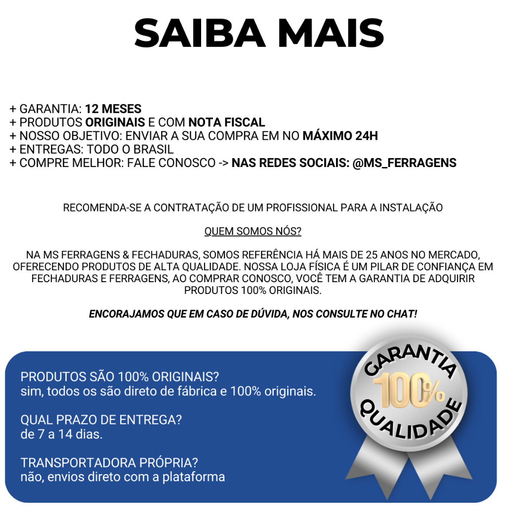 Fechadura Segurança Trava Tetra Stam 1004 Com 4 Chaves Porta de Madeira e Alumínio Antique === ATENÇÃO === NÃO ACOMPANHA MAÇANETA === ATENÇÃO === SOBRE O PRODUTO: - Marca: Stam - Linha: Auxiliar - Modelo: 1004 - Cor: Antique - Acabamento: Inox Escovado - Tipo de Trinco: Trava Tetra - Tipo de Instalação: Porta de Madeira e Aluminio - Quantidade de Chaves: 4 - Roseta: Redonda SAIBA MAIS: + GARANTIA: 12 Meses + DISPONIBILIDADE: Cromado, Escovado e Antique + PRODUTOS ORIGINAIS e COM NF + NOSSO OBJETIVO: Enviar a sua compra em no máximo 24h + ENTREGAS: Todo o Brasil Lembre-se: Recomenda a contratação de um profissional para instalação! Quem somos nós? Na MS Ferragens & Fechaduras, somos referência há mais de 25 anos no mercado, oferecendo produtos de alta qualidade. Nossa loja física é um pilar de confiança em fechaduras e ferragens, ao comprar conosco, você tem a garantia de adquirir produtos 100% originais. Encorajamos que em caso de dúvida, nos consulte no Chat! PERGUNTAS FREQUENTES: PRODUTOS SÃO 100% ORIGiNAIS? sim, todos os são direto de fabrica e 100% originais. A FECHADURA É COMPLETA? sim, você receberá uma fechadura conforme o anunciado toda completa pronta para montagem. QUAL PRAZO DE ENTREGA? Nós despachamos em dias úteis em até 24h, após entra no centro logistico da Shopee e a entrega é toda por conta deles.