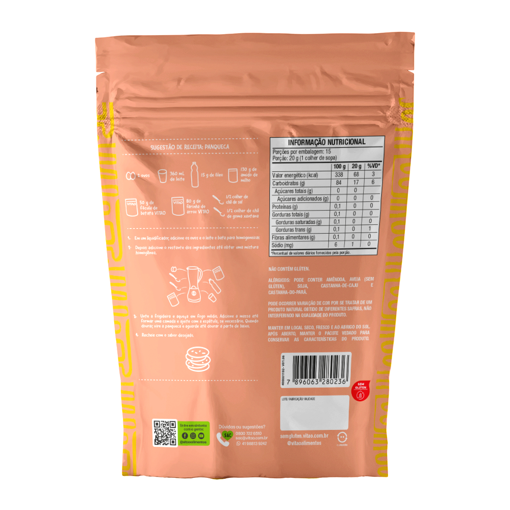 A fécula de batata da Vitao é um ingrediente versátil e livre de glúten que pode ser utilizado em diversas receitas culinárias. Obtida a partir da extração do amido presente nas batatas, a fécula de batata é uma alternativa saudável e natural para espessar e dar consistência a pratos e sobremesas. Com uma textura fina e suave, a fécula de batata é ideal para o preparo de molhos, cremes, pudins, bolos e biscoitos. Além disso, ela é conhecida por sua capacidade de proporcionar maciez e leveza às preparações. A fécula de batata da Vitao é livre de aditivos artificiais e conservantes, garantindo uma opção pura e de qualidade. SUGESTÃO DE RECEITA: Panqueca - ½ colher de chá de sal - 2 ovos - 15g de óleo - 50g de fécula de batata VITAO - 80g de farinha de arroz - 130g de amido de milho - 360mL de leite - ½ colher de chá de goma xantana - Em um liquidificador, adicione os ovos e o leite e bata para homogeneizar. - Depois adicione o restante dos ingredientes até obter uma mistura homogênea. - Unte a frigideira e aqueça em fogo médio. Adicione a massa até formar uma camada e ajeite com a espátula, se necessário. Quando dourar, vire a panqueca e aguarde até dourar a parte de baixo. - Recheie com o sabor desejado. INGREDIENTES: Fécula de batata. ALÉRGICOS: PODE CONTER AMÊNDOA, AVEIA (SEM GLÚTEN), SOJA, CASTANHA-DE-CAJU E CASTANHA-DO-PARÁ. NÃO CONTÉM GLÚTEN.