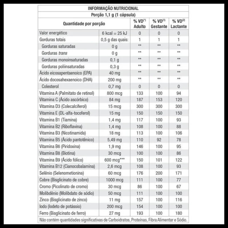 O Suplemento Alimentar Feminis com DHA da Eurofarma é a escolha ideal para mulheres e gestante que buscam um suporte nutricional completo. Com uma fórmula rica em vitaminas e minerais essenciais, este multivitamínico foi desenvolvido para promover a saúde e o bem-estar feminino, contribuindo para a beleza de dentro para fora. Cada cápsula contém uma combinação poderosa de Omega 3, Vitamina A, D, E e do complexo B, além de minerais como Cobre, Ferro, Iodo e Zinco. Esses ingredientes são fundamentais para fortalecer o sistema imunológico, melhorar a saúde da pele e cabelos, e auxiliar na manutenção de níveis adequados de energia ao longo do dia. O Feminis é livre de glúten e lactose, tornando-se uma opção segura para diferentes dietas. A embalagem prática em caixa facilita o armazenamento e o transporte, permitindo que você leve seu suplemento para qualquer lugar. Invista na sua saúde e beleza com o Suplemento Alimentar Feminis com DHA da Eurofarma, e sinta a diferença que uma nutrição adequada pode fazer na sua vida.