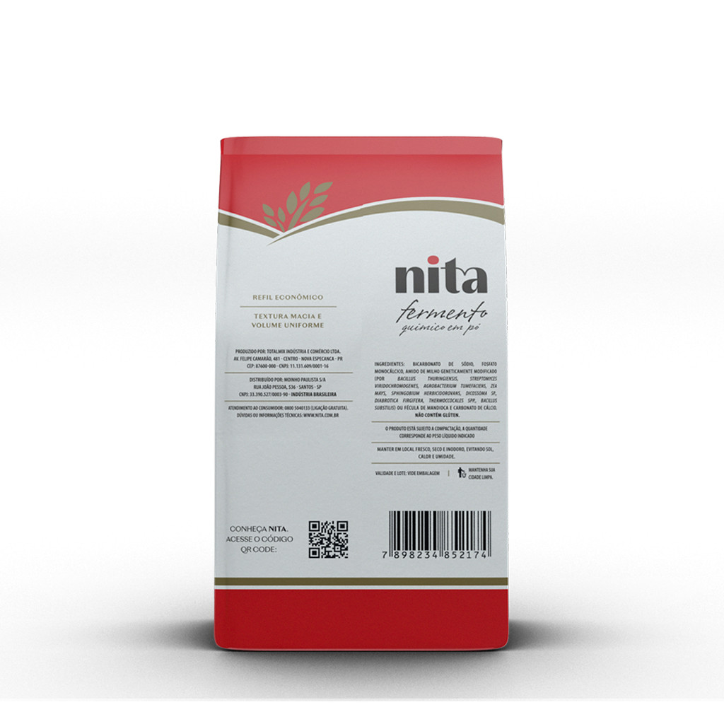 Fermento em Pó Químico Refil - Nita Fermento químico em pó 2kg. Não contém glúten. Principais Aplicações: Bolos, tortas. Lista de Ingredientes: Bicarbonato de sódio, fosfato monocálcico, amido de milho geneticamente modificado (por Bacillus thuringiensis, Streptomyces viridochromogenes, Agrobacterium tumefaciens, Zea mays, Sphingobium herbicidorovans, Dicossoma sp., Diabrotica firgifera, Thermoccocales spp., Bacillus substilis) ou fécula de mandioca e carbonato de cálcio. Características Físico-QuímicasResolução da Anvisa nº 38 de 27/12/1977 Características MicrobiológicasResolução ANVS nº 331 de 23 de dezembro 2019. Não contém glúten. Prazo de Validade: 12 meses a contar da data de fabricação, sob condições adequadas de armazenagem. Conservação: Manter em local fresco, seco e inodoro, evitando sol, calor e umidade.
