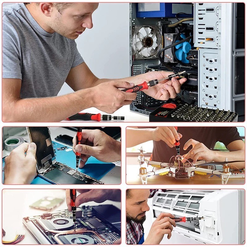Kit Chave 115 em 1. Ferramentas de manutenção, amplamente utilizado em telefones móveis, digitais, eletrodomésticos e outros campos. Reparação consoles de jogos, computadores, dispositivos móveis, câmeras de precisão e outros itens como relógios e óculos. Itens Inclusos: 1x caixa estojo (plástico) 1x eixo de extensão flexível 1x barra de extensão 128mm 1x pinça 122mm 3x ferramentas de alavanca de plástico ( 86mm e 82mm ) 1x ferramentas de remoção de cartão sim 33mm 1x chave 98mm 1x ventosa 35mm 1x magnecia bloco 1x agulha para remoção cartão SIM 3x palhetas de abertura (35x37mm e 31x33mm) 1x suporte de broca para chave de fenda elétrica 1x adaptador sleeve 98x bits chave de fenda Especificação das chaves: PH000, PH000, PH00, PH00, PH0, PH0, PH1, PH1, PH2, e PH2 M, word, pzo, pzo, pz1, pz1, pz2 e pz2 Em linha reta: 1.0, 1.5, 2.0, 2.5, 3.0, 3.5 e 4.0 Em linha reta: 1/16, 5/64, 3/32, 7/64, 1/8, 9/64 e 5/32 Cinco estrelas: 0.8, 0.8, 1.2, 1.2, 1.5, 1.5, 2.0 e 2.0 Torx: t3, t3, t4, t4, t5, t5, t6, t6, t7, t7, t8, t8, t9, t9, t10, T10, T15, T15, T20, e T20 Hexágono: 07, 0.9, 13, 1.3, 1.5, 1.5, 2.0, 2.0, z5, 2.5, 3.0, 3.0, 3.5, 4, 0 e 4.0 Hexágono: 1/16, 5/64, 3/32, 7/64, 1/8, 9/64 e 5/32 Triângulo: 2.0, 2.3, 2.7 e 3.0 Forma "u": 2.6 e 2.6 Forma "y": 2.0 e 3.0 Soquete de 4mm: m2.5, m3.0, m3.5, m4.0, m4.0, m4.5, m5.0 e m5.5