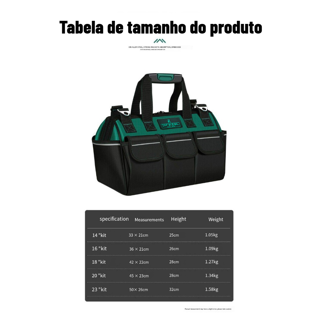 Kit Bolsa para Ferramentas de Eletricista - Resistente, Portátil e Multiuso Bem-vindo à nossa loja! Conheça a bolsa ideal para organização profissional. Modelos Disponíveis: 14 Polegadas: 33x19x22 cm 16 Polegadas + Base: 37x22x27 cm 14 Polegadas + Alças: 33x21x25 cm 18 Polegadas + Alças: 42x22x28 cm 20 Polegadas: 45x26x30 cm 23 Polegadas + Alças: 50x26x32 cm Cor: Preto e Verde CARACTERÍSTICAS PRINCIPAIS: 🛠️ Resistência Garantida Fabricada em lona Oxford reforçada, oferecendo máxima durabilidade para o trabalho pesado. 🌧️ Proteção Completa Material 100% impermeável, blindando suas ferramentas contra chuva, umidade e poeira. 🎯 Design Inteligente Compartimento principal com ampla capacidade 3D Múltiplos bolsos internos e externos (frontal, traseiro e lateral) Organização prática para ferramentas elétricas e manuais 💡 Praticidade no Dia a Dia Leve e fácil de transportar Ideal para manutenção, trabalhos em madeira e serviços elétricos INFORMAÇÕES IMPORTANTES: As cores podem variar levemente devido às configurações de tela Medidas sujeitas a pequenas variações de 1-2 cm FRETE RÁPIDO - Entrega em todo o Brasil! Garanta já seu kit - Perfeito para profissionais que exigem durabilidade e organização Tem dúvidas? Nossa equipe está pronta para ajudar! Agradecemos pela preferência! 🛠️ #FerramentasOrganizadas #Eletricista #BolsaProfissional #KitFerramentas #TrabalhoPesado #Manutenção #FaçaVocêMesmo #DiaDeTrabalho #Organização #FerramentasElétricas