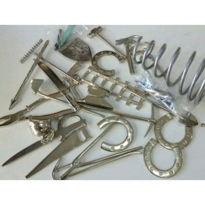 Conjunto de ferramentas para assentamento de Orixá Ogum (conforme preceitos do Batuque do RS). Aqui você pode escolher quais ferramentas deseja. Escolha conforme sua necessidade e quantidade. Ferramentas em miniaturas de alta qualidade, com acabamento perfeito. Compra por unidade.
