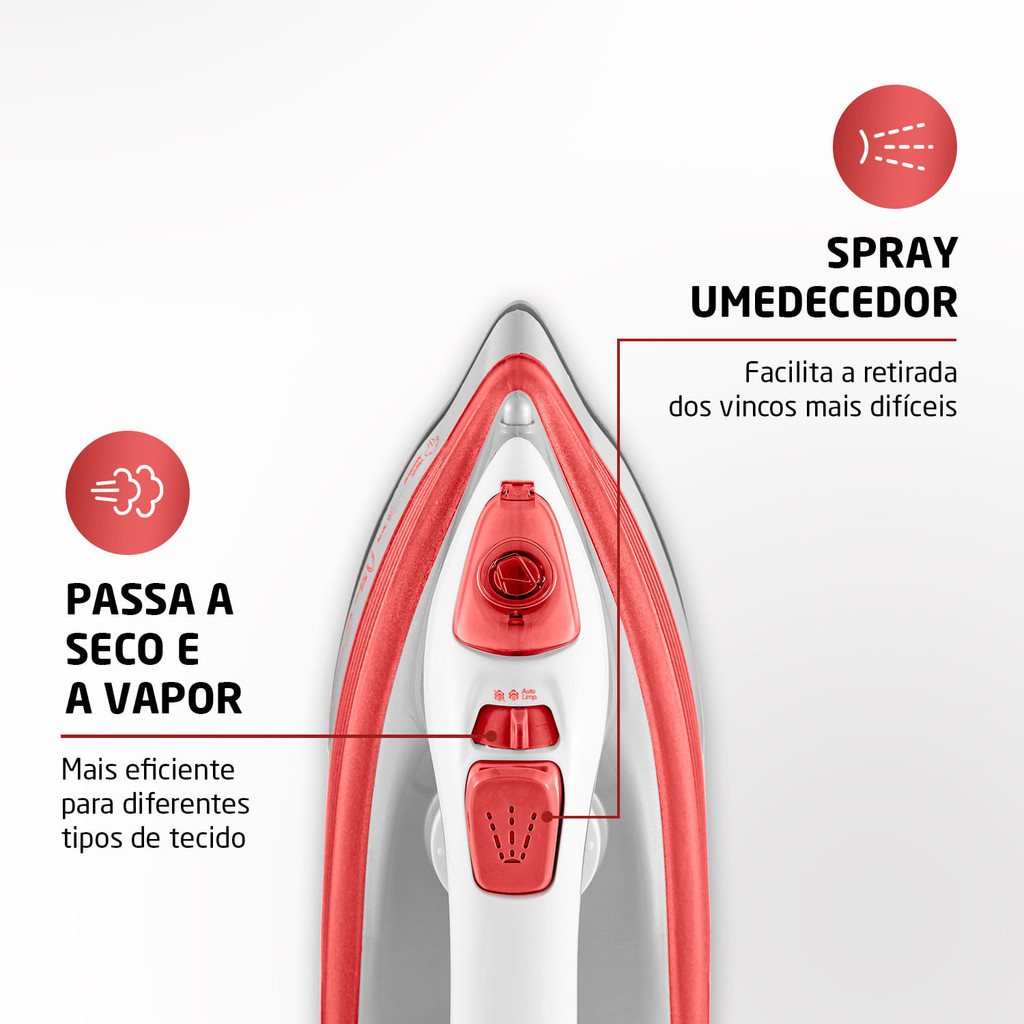 Com o Ferro a Vapor FVN-01 da Mondial, você vai passar suas roupas com menos esforço e mais agilidade. A tecnologia da Base Cerâmica Diamante permite que o ferro deslize suavemente sobre o tecido e passe mais rápido. Se você precisa tirar amassados e vincos mais difíceis, as funções Vapor Contínuo, que libera alta quantidade de vapor, e Spray Umedecedor são seus aliados. Saiba mais sobre os benefícios do Ferro a Vapor Mondial: BASE CERÂMICA DIAMANTE: A tecnologia permite que o ferro deslize suavemente sobre o tecido e passa mais rápido. A agilidade na hora de passar roupas é garantida! PASSA A SECO E A VAPOR: Com a variação, você pode passar diferentes tipos de tecido de forma mais eficiente. VAPOR CONTÍNUO E SPRAY: O ferro libera alta quantidade de vapor e possibilita remover os amassados das roupas. Além disso, o spray umedecedor é mais um aliado na tarefa e facilita a retirada dos vincos mais difíceis. RESERVATÓRIO DE 220ml: Proporciona maior autonomia e praticidade ao passar. SISTEMA AUTOLIMPEZA: Limpa o acúmulo de minerais e resíduos nas saídas de vapor. CABO GIRATÓRIO DE 360°: Maior autonomia de movimento durante o uso: cabo embolado nunca mais! SELETOR DE TEMPERATURA E LED LUMINOSO: É possível controlar a temperatura ideal, de acordo com cada tipo de tecido. O Led luminoso indica, ao apagar, que o ferro está na temperatura escolhida para passar. SALVA BOTÕES: O sistema Salva Botões em toda a base protege os botões das suas roupas e garante acabamento perfeito. PONTA DE PRECISÃO: Permite alcançar com facilidade as áreas de difícil acesso na hora de passar. UM ANO DE GARANTIA MONDIAL: A Mondial é a escolha de milhões de consumidores. Mondial, a escolha inteligente!