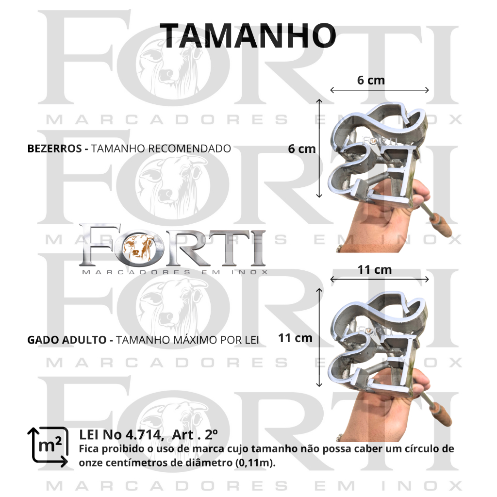 Marcadores de gado em AÇO INOX, material especial para a marcação de animais, pois retém o calor, marcando o animal com menos risco de queimaduras e não havendo a necessidade de apertar no coro do animal para a marcação. Além de ser um material extremamente resistente e não ENFERRUJA. ****ENVIO NO PRAZO DE 5 DIAS**** ESPECIFICAÇÕES: - PERSONALIZADO. - Animal: bovinos (bois e vacas) e equinos (cavalos). - Material: Aço Inox (não descasca e não enferruja) - Cabo: madeira tratada com suporte para o dedão. - Comprimento da haste: 30 cm. - Comprimento do cabo: 20,5 cm. Comprimento total: 40 cm. Espessura: varia de acordo com o desenho. Largura: varia de acordo com o desenho. Kg: varia de acordo com o desenho e quantidade de letras. ::Conteúdo da Embalagem:: 1 MARCADOR DE GADO EM AÇO INOX (No modelo especifico do titulo do anuncio). Garantia: não cobrimos garantia do uso indevido do produto. Garantia de 1 ano. ( PRODUTO INSPECIONADO E TESTADO) IMPORTANTE: - Após a compra e compensação do valor combinamos o layout da marca. Desenhamos até que fique 100% do seu agrado. Compras por meio de boleto demoram de 1 a 3 dias úteis para compensação do valor. QUALQUER DUVIDA FIQUE A VONTADE PARA NOS CONTACTAR.