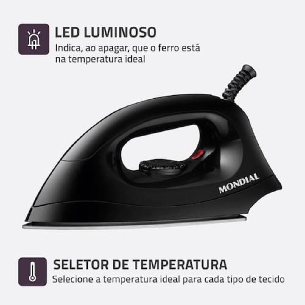 Ferro de Passar Roupa a Seco Mondial FSN-55-B Preto 127v Cabo 1,5 Metros 1200w