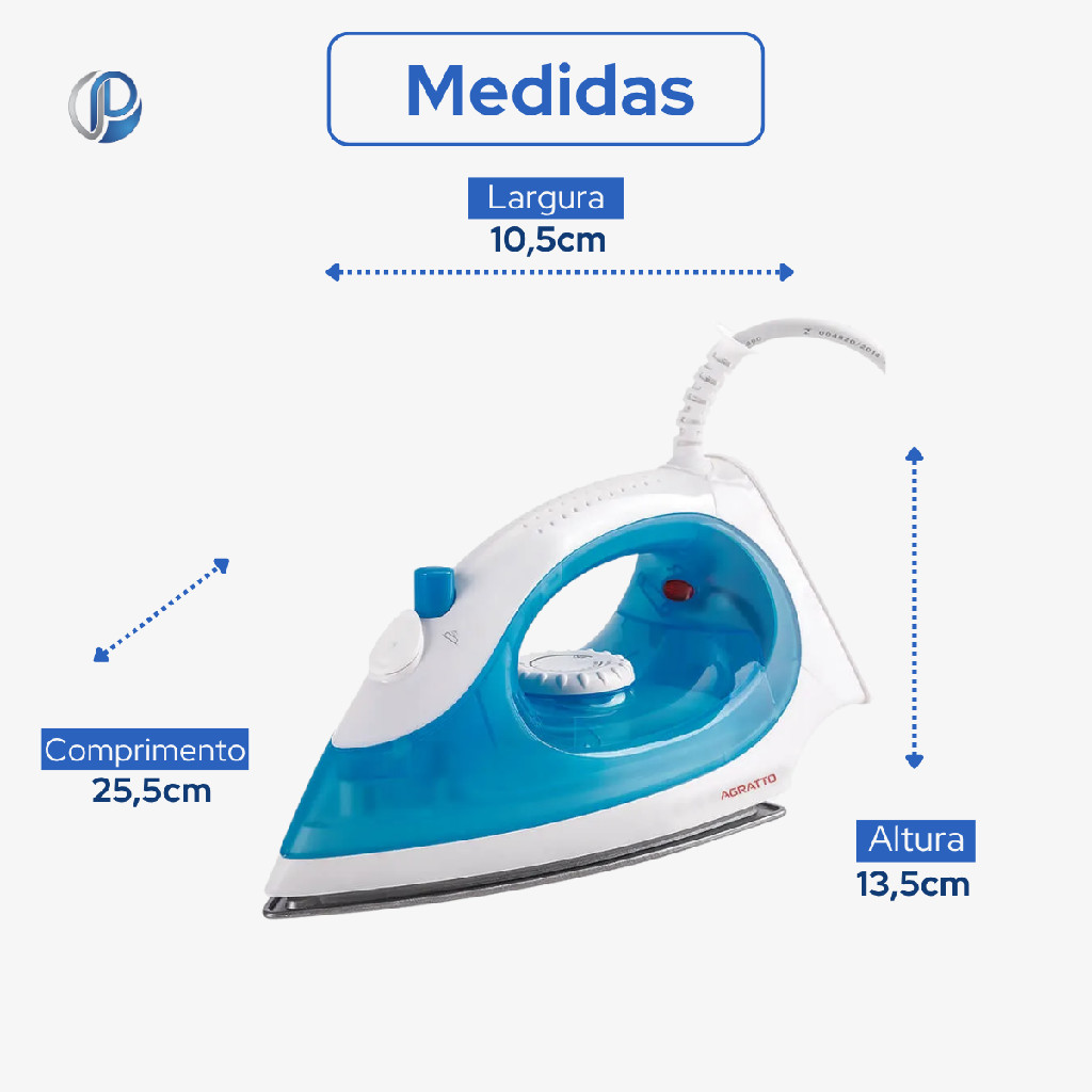 Ferro De Passar A Vapor Azul Vapore Agratto 220VCompacto e leve, o Ferro de Passar Vapore da Agratto é prático e ideal para passar roupas a seco ou a vapor. Conta com seletor de tipo de tecido que garante mais versatilidade ao produto.Atributos do Produto:Referência: 6056Código: 6056Código de Barras: 7898461966583Cor: Azul e brancoMarca: AgrattoModelo: FV-02Potência: 1400WVoltagem: 220VDetalhes e Especificações Técnicas:- Alça ergonômica- Protetor de Cabo- Base antiaderente- Design compacto e leve- Acompanha copo dosador- Regulagem de temperatura- Jato de vapor que desamassa com mais facilidade- Pontas arredondadas que evitam perfurações e não arrancam botões- Luz de funcionamento que avisa quando o ferro está em funcionamento e aquecidoDimensões do Produto:Altura: 13,5 cmLargura: 10,5 cmComprimento: 25,5 cmPeso: 0,75 KgConteúdo da Embalagem:01 Ferro De Passar A Vapor Azul Vapore Agratto 220V01 Manual de instruçõesImportante- Produtos de decoração não inclusos. Imagens meramente ilustrativas;- As cores dos objetos podem sofrer alterações devido a luminosidade, configurações do monitor e até mesmo a percepção do usuário;*Os dados divulgados são de responsabilidade do fabricante/fornecedor.