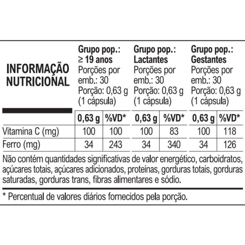 INFORMAÇÕES DE DESTAQUE Alta concentração e biodisponibilidade; 34mg de Bisglicinato Ferroso por cápsula; Fonte de Vitamina C; Zero açúcar e glúten; Vegano. DESCRIÇÃO FERRO PLUS é um suplemento alimentar com alta concentração de ferro e vitamina C. O ferro é um mineral essencial para o corpo, já que participa de processos fundamentais, como a produção de energia, a replicação do DNA e, principalmente, o transporte de oxigênio no sangue por meio da hemoglobina. Por isso, manter os níveis de ferro adequados é essencial para garantir o bom funcionamento do corpo, fortalecer o sistema imunológico e apoiar o desenvolvimento saudável do cérebro. COMPOSIÇÃO Bisglicinato ferroso (ferro), ácido ascórbico (vitamina C), agente de massa celulose microcristalina, antiumectantes dióxido de silício e estearato de magnésio, cápsula: água purificada, amido modificado, estabilizante hidroxipropilmetilcelulose (HPMC), corante carbonato de cálcio, gelificante carragena e regulador de acidez acetato de potássio. NÃO CONTÉM GLÚTEN. SUGESTÃO DE USO Suplemento alimentar de uso adulto a partir de 19 anos, gestantes e lactantes: consumir 1 cápsula ao dia, em qualquer horário, ou conforme orientação de um profissional de saúde.