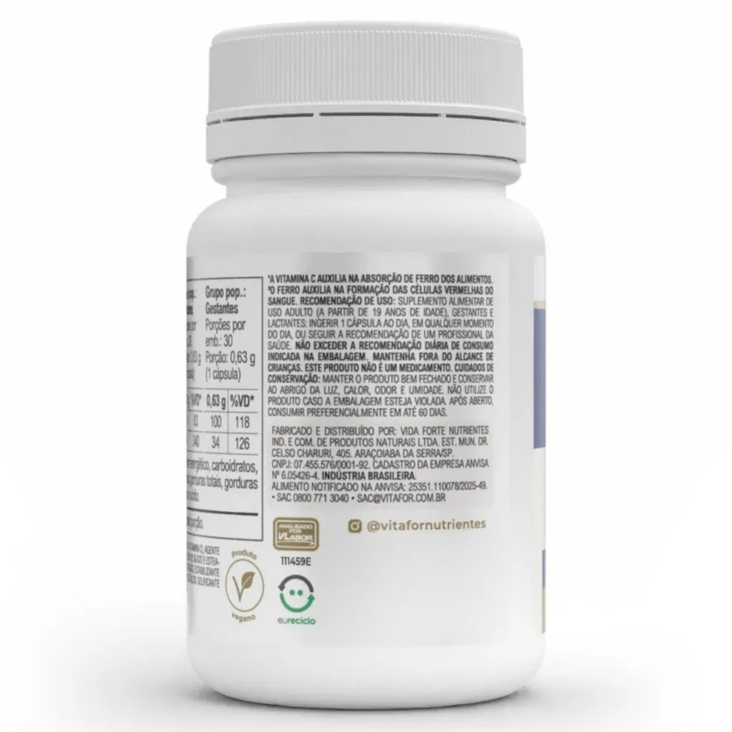 Ferro Plus Vitafor – Suplemento de Ferro + Vitamina C – 30 Cápsulas de 500mg Sobre o produto: O Ferro Plus Vitafor é um suplemento alimentar formulado com bisglicinato ferroso, uma forma altamente biodisponível de ferro, associado à vitamina C, que potencializa sua absorção e auxilia na proteção antioxidante do organismo. Desenvolvido para suprir as necessidades diárias de ferro de forma eficaz, o produto contribui para a formação das células vermelhas do sangue, o transporte de oxigênio e o bom funcionamento do sistema imunológico. É indicado para adultos, gestantes e lactantes que necessitam manter níveis adequados desse mineral essencial. Como consumir - Consumir 1 cápsula ao dia, em qualquer horário, ou conforme orientação de um profissional de saúde. - Uso indicado para adultos (a partir de 19 anos), gestantes e lactantes. Benefícios - Auxilia na formação das células vermelhas do sangue. - Contribui para o metabolismo energético. - Auxilia no transporte de oxigênio pelo corpo. - Participa do processo de divisão celular. - Auxilia no funcionamento do sistema imune. - Benefícios da Vitamina C: - Auxilia na absorção do ferro dos alimentos. - Contribui para a proteção das células contra os radicais livres. - Auxilia no funcionamento do sistema imunológico. - Contribui para a formação do colágeno. - Auxilia na regeneração da forma reduzida da vitamina E. - Contribui para o metabolismo energético. - Auxilia no metabolismo de proteínas e gorduras. Diferenciais - Alta concentração e excelente biodisponibilidade. - 34 mg de bisglicinato ferroso por cápsula. - Fonte de vitamina C. - Zero açúcar e glúten. - Produto 100% vegano. Alergênicos: Não contém glúten. Ingredientes: Bisglicinato ferroso (ferro), ácido ascórbico (vitamina C), agente de massa celulose microcristalina, antiumectantes dióxido de silício e estearato de magnésio.Composição da cápsula: água purificada, amido modificado, estabilizante hidroxipropilmetilcelulose (HPMC), corante carbonato de cálcio, gelificante carragena e regulador de acidez acetato de potássio. Advertências - Este produto é destinado ao público adulto. - Gestantes, lactantes e pessoas com condições de saúde específicas devem consumir sob orientação médica ou de nutricionista. - Não exceder a recomendação diária de consumo indicada na embalagem. - Mantenha o produto fora do alcance de crianças. - Conservar em local fresco, seco e ao abrigo da luz. Conclusão: O Ferro Plus Vitafor é uma excelente opção para quem busca um suplemento de ferro com alta absorção e eficiência. Sua fórmula combina bisglicinato ferroso e vitamina C, proporcionando suporte essencial à formação de hemoglobina, à energia diária e ao fortalecimento do sistema imunológico. Livre de glúten, açúcar e ingredientes de origem animal, é uma escolha segura e eficaz para o cuidado nutricional e manutenção da saúde.