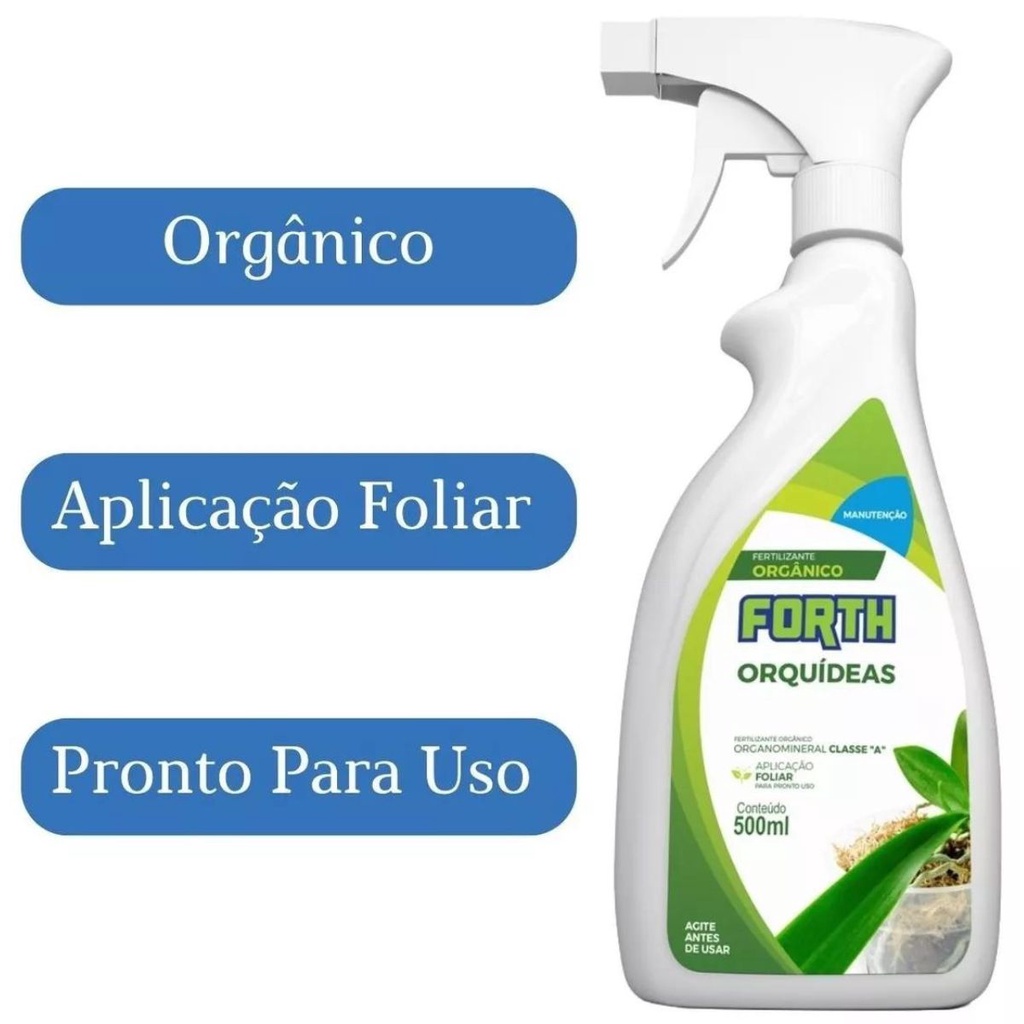 Fertilizante Adubo Orgânico Forth Orquídeas Manutenção 500ml Esse adubo é para aquela sua orquídea que está só com folhas ou então acabou o período de floração. Vai deixar as folhas bem nutridas e a planta pronta para soltar a próxima florada. Porque usar Forth Orquídeas Manutenção: 1. Prático e de fácil aplicação. 2. Contém todos os nutrientes necessários para a fase de manutenção. 3. Aumenta o desenvolvimento das raízes. 4. Fortalecimento da orquídea na pré-florada. 5. Cores mais vivas para flores e folhas. 6. Não é tóxico. Utilização: Via Foliar. Dosagem: Pronto para uso. Frequência de uso: Semanal. Modo de aplicação: Pulverizar as folhas no momento mais fresco do dia. Informações de pronto uso: Natureza física: Solução. Categoria: Fertilizante orgânico organomineral classe "A". Validade: 2 anos da data de fabricação do produto. Registro Estabelecimento Mapa: (EP) SP-003204-2. Registro Produto Mapa: SP - 003204-2.000023.