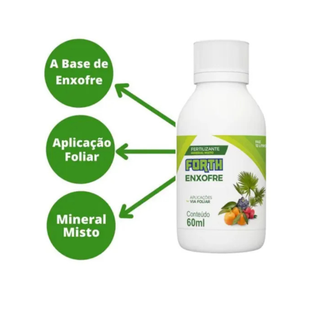 FERTILIZANTE FORTH ENXOFRE 60ML CONCENTRADO O Forth Enxofre é um fertilizante líquido ideal para pulverizar plantas em geral. O Enxofre é um componente essencial à todas as proteínas das plantas. Ele aumenta a cor verde das folhas, auxilia no crescimento e ajuda na formação das sementes e frutos. A falta do enxofre faz com que as novas folhas fiquem amareladas e com nervuras mais claras, os caules ficam curtos e amarelados e o crescimento da planta diminui. Com esse fertilizante, você vai fazer uma boa complementação para as plantas e elas ficarão bem nutridas e com aquele verde especial. Níveis de Garantia: Nitrogênio (N): 2% Enxofre (S): 22% Sulfato: 0,799% INFORMAÇÕES DO PRODUTO: Natureza Física: Fluido - Suspensão Concentrada. Densidade (20ºC): 1,33g/cm³ Maior rel. soluto/solvente: 5ml/L Antes de adubar é importante que a planta esteja bem hidratada. Caso ela apresente sintomas de falta de água, regue e deixe para aplicar o fertilizante no dia seguinte.