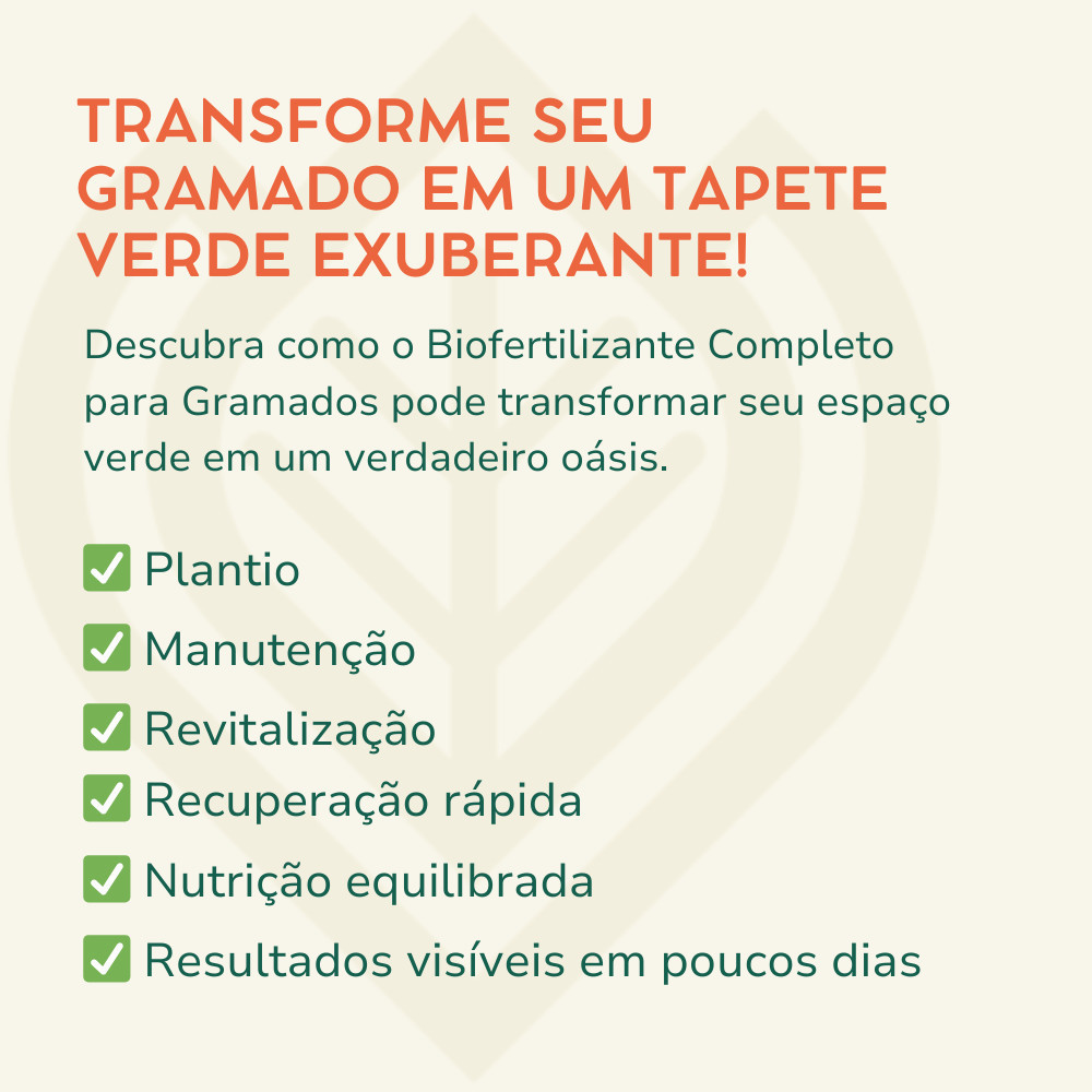 Fertilizante orgânico líquido concentrado para gramados. Rende até 200L. Nutrição completa com Bokashi, esterco, algas e hidrolisado de peixe. Cobre até 2.000m². Aplicação e Eficiência: Diluição recomendada: 100ml para 10L de água Plantio: aplicar semanalmente nas 4–6 primeiras semanas Manutenção: aplicar a cada 15–20 dias Revitalização: aplicar a cada 7–10 dias Cobertura estimada: até 2.000m² Benefícios Fórmula 100% orgânica com NPK 4-2-2 natural Rende até 200 litros de solução Bokashi e EM (microrganismos eficientes) para revitalização do solo Alto teor de nitrogênio para folhas mais verdes e densa cobertura Contém algas marinhas, esterco e hidrolisado de peixe Fortalece raízes e aumenta resistência contra doenças Recupera áreas secas, amareladas e desgastadas Ideal para manutenção, plantio ou gramados ornamentais Aplicação via regador, irrigação ou pulverizador Seguro para pets e o meio ambiente