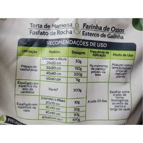 Fertilizante Orgânico 4 em 1 Mamona Osso Esterco e Fosfato (1kg) MAXGREEN Descrição * A combinação de Torta de Mamona, Farinha de Ossos, Fosfato de Rocha e Esterco de Galinha se complementam para criar um fertilizante 4 em 1.* Completo com N, P, Ca e Carbono Orgânico, ideal para cultivos orgânicos. * Adubo 4 em 1, fonte de nitrogenio, fósforo, cálcio e matéria orgânica. Características * Matéria prima: Torta vegetal, Farinha de ossos calcinada, esterco de galinha e fosfato natural reativo. * Natureza Fisica: Sólido. Produto sem especifiação granulométrica definida * Embalagem: Pack de 1kg Garantia Mínima Nitrogênio total (N total) .........1% Fósforo total (P205 total).....................................................12% Fósforo sol. Ácido cítricoo (P205 sol. Ác. cítrico)...........7% Cálcio total (Ca total)................................................................13% Capacidade de troca catiônica (CTC) 80 M.Molc/kg Carbono orgânico total (COT) ..............................................12% Umidade Máxima (Umidade Máx)..................................10% Informações/Dicas/Usos * Indicação de Uso: Ideal para adubação de cultivos orgânicos. * Antes de adubar é importante que a planta esteja bem hidratada, caso esteja com sintomas de falta de água, fazer a regra e adubar no dia seguinte. * Produto para uso exclusivo como fertilizante fornecedor de nutrientes para plantas.