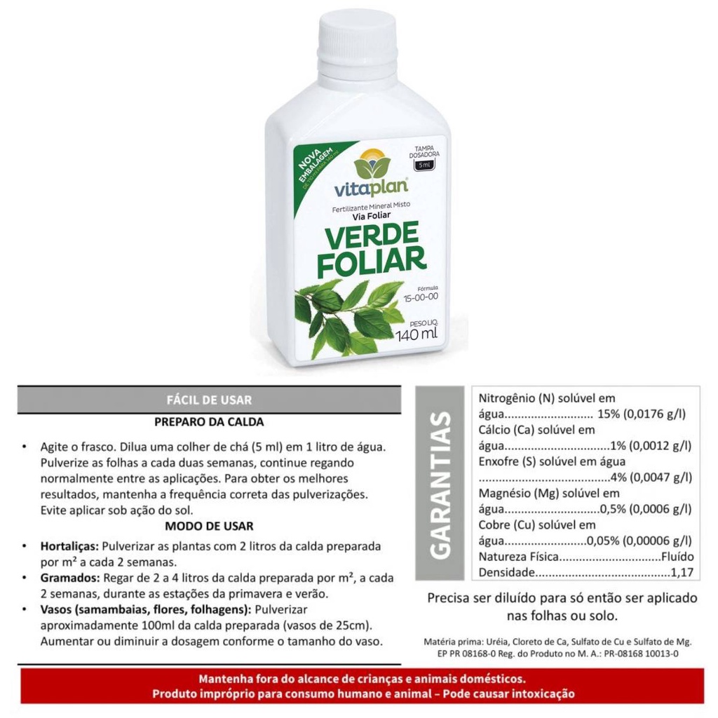 Fertilizante Verde Foliar + Verde Raiz (140ml) VITAPLAN Descrição: Fertilizante Verde Foliar * É um fertilizante líquido com uma grande quantidade significativa de nitrogênio. * Ideal para o cuidado regular com folhagens e plantas na fase de crescimento até a floração. Características * Peso Líquido: 140ml * NPK: 15-00-00 * Matéria prima: Uréia, Cloreto de Ca, Sulfato de Cu e Sulfato de Mg. * Nitrogênio (N) solúvel em água················· 15% (0,0176 g/l) * Cálcio (Ca) solúvel em água························ 1% (0,0012 g/l) * Enxofre (S) solúvel em água ······················· 4% (0,0047 g/l) * Magnésio (Mg) solúvel em água··············· 0,5% (0,0006 g/l) * Cobre (Cu) solúvel em água················· 0,05% (0,00006 g/l) * Natureza Física·························································· Fluído * Densidade···································································· 1,17 * Registro: M.A.P.A PR-001365-0.000017 Descrição: Fertilizante Verde Raiz * É um fertilizante líquido de absorção radicular com macronutrientes equilibrados que proporcionam um melhor desenvolvimento das plantas. * Ideal para a nutrição regular das plantas nas fases de crescimento, floração e frutificação. * Fertilizante líquido, prático e de fácil aplicação. Características * Peso Líquido: 140ml * NPK: 04-14-08 * Matéria prima: Uréia, Ác. Fosfórico e Kcl. * Modo de aplicação: Via solo * Nitrogênio (N) solúvel em água······································ 4 % * Fosfóro (P2O5) solúvel em CNA + água······················· 14 % * Potássio (K2O) solúvel em água····································· 8 % * Densidade······································································ 1,25 * Natureza Física···························································· Fluido * Registro: M.A.P.A PR-08168 10011-3 Informações/Dicas/Usos * Produtos concentrados precisam ser diluídos para então ser aplicado nas folhas ou solo. Cultiv.me trabalha desde 2013 para trazer os melhores produtos de jardinagem ao alcance de todos. Acreditamos que cuidar da natureza deve ser acessível para todos. Cultiv.me o verde que faltava.
