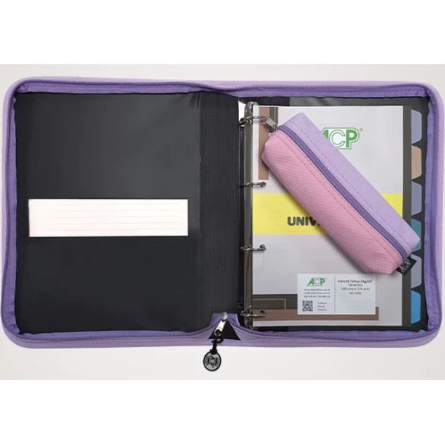 Fichário Universitário Escolar Argolado Bicolor Com Bloco de Folhas e Divisórias Rosa e Lilás ACP Esse lindo fichário vai tornar seu dia a dia ainda mais prático. Vem com bloco de 96 folhas pautadas, 6 divisórias tons pastéis e estojo na cor do fichário com capacidade para 40 lápis. O estojo pode ser removido se adaptando à necessidade do usuário. Ótimo acabamento e custo benefício. Características Estojo removível de uma divisória (Medida do estojo: 200 mm x 50 mm x 50 mm) Argolamento removível 6 Divisórias Coloridas Tons Pastéis Fechamento em zíper Ferragem 96 Folhas Pautadas Puxador em metal 4 Argolas Tamanho: 270 mm x 345 mm x 45 mm Composição: Pvc, Nylon, Poliéster, Papelão, PP, Masterbatch, Metal, Zíper e Cursor. Folhas: Tamanho A4 Marca: ACP Comporta em média 300 folhas.