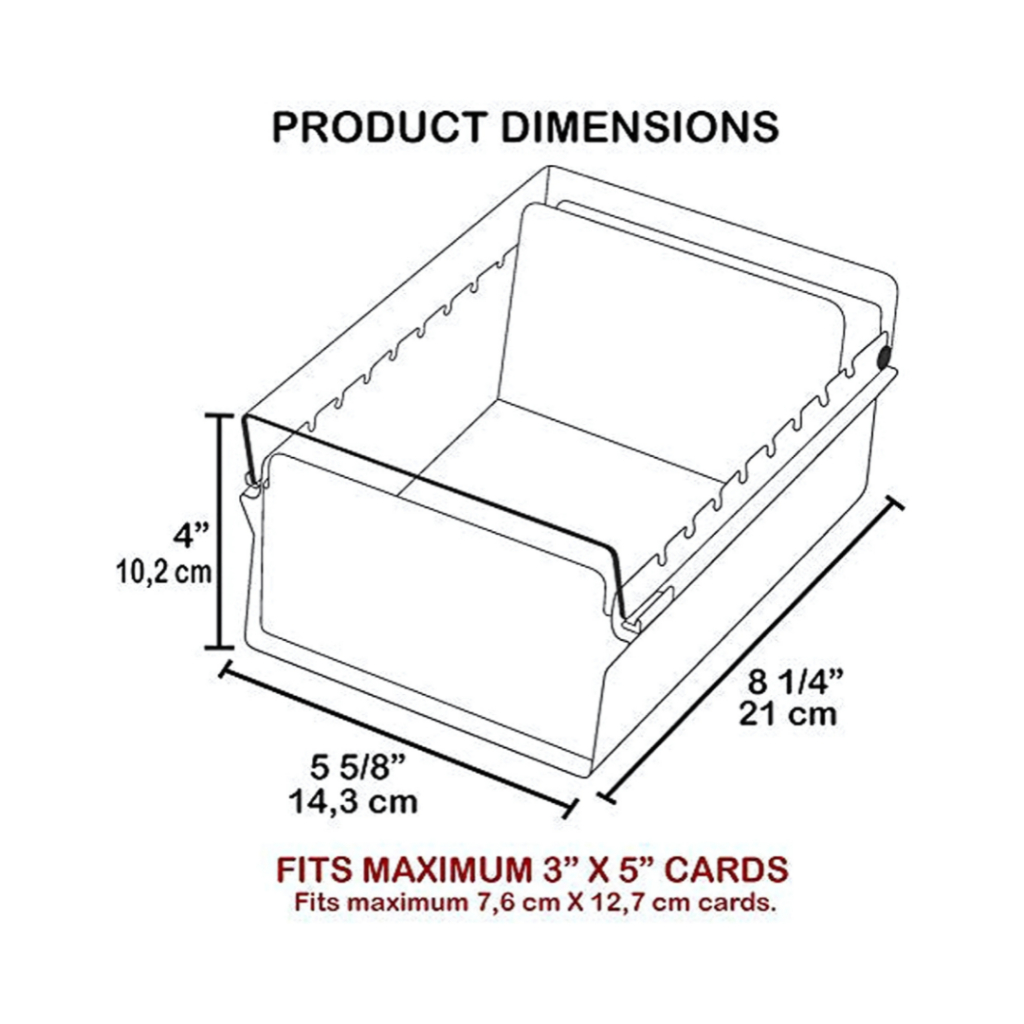 Fichário com corpo em aço na cor grafite, com tampa em poliestireno. Possui capacidade para até 500 fichas tamanho 3´´X 5´´. Contém divisória de plástico para auxiliar equilíbrio dos cartões no fichário. Acompanha índice A-Z. Dimensões externas: 10 cm altura x 15,8 cm largura x 21 cm profundidade REF: 921