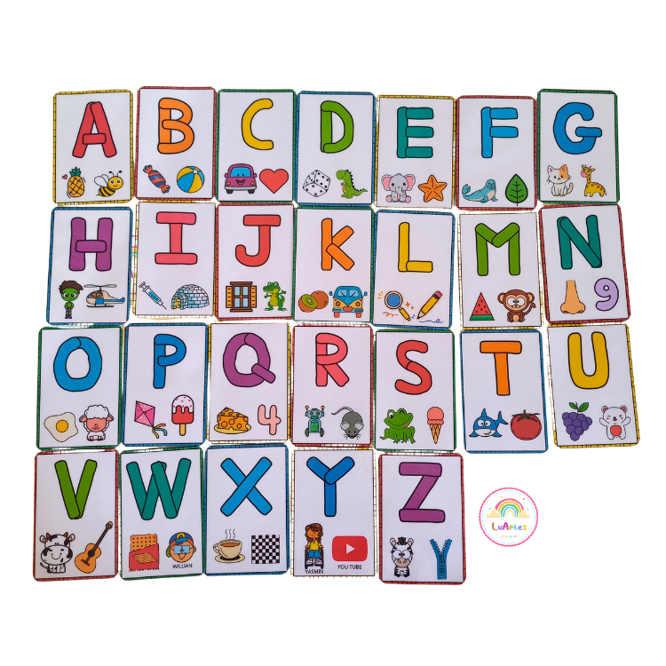 Produto: Alfabeto Ilustrado – 26 Letras Plastificadas (Alfabetização lúdica) Quantidade: 26 fichas Tamanho: 10 cm x 7 cm por ficha Material: Plastificado (resistente e durável)