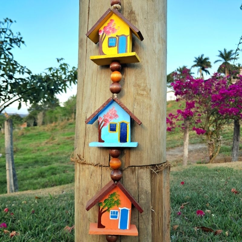 Lindas fieiras de casinhas de madeira 100% artesanal e pintadas à mão. com detalhes em sisal e contas de madeira. Essas lindas casinhas darão um charme e um toque de delicadeza e alegria ao seu lar. Também são uma ótima opção para presentear. Cada fieira mede no total: 60 cm de comprimento Peso: 330gr Material: Madeira Pinus/ sisal e contas de madeira. ‼️Observação importante‼️ as cores podem variam dependendo da disponibilidade. Mas fique tranquilo (a) que sempre enviaremos peças lindas, com cores perfeitas e muito bem pintadas🥰