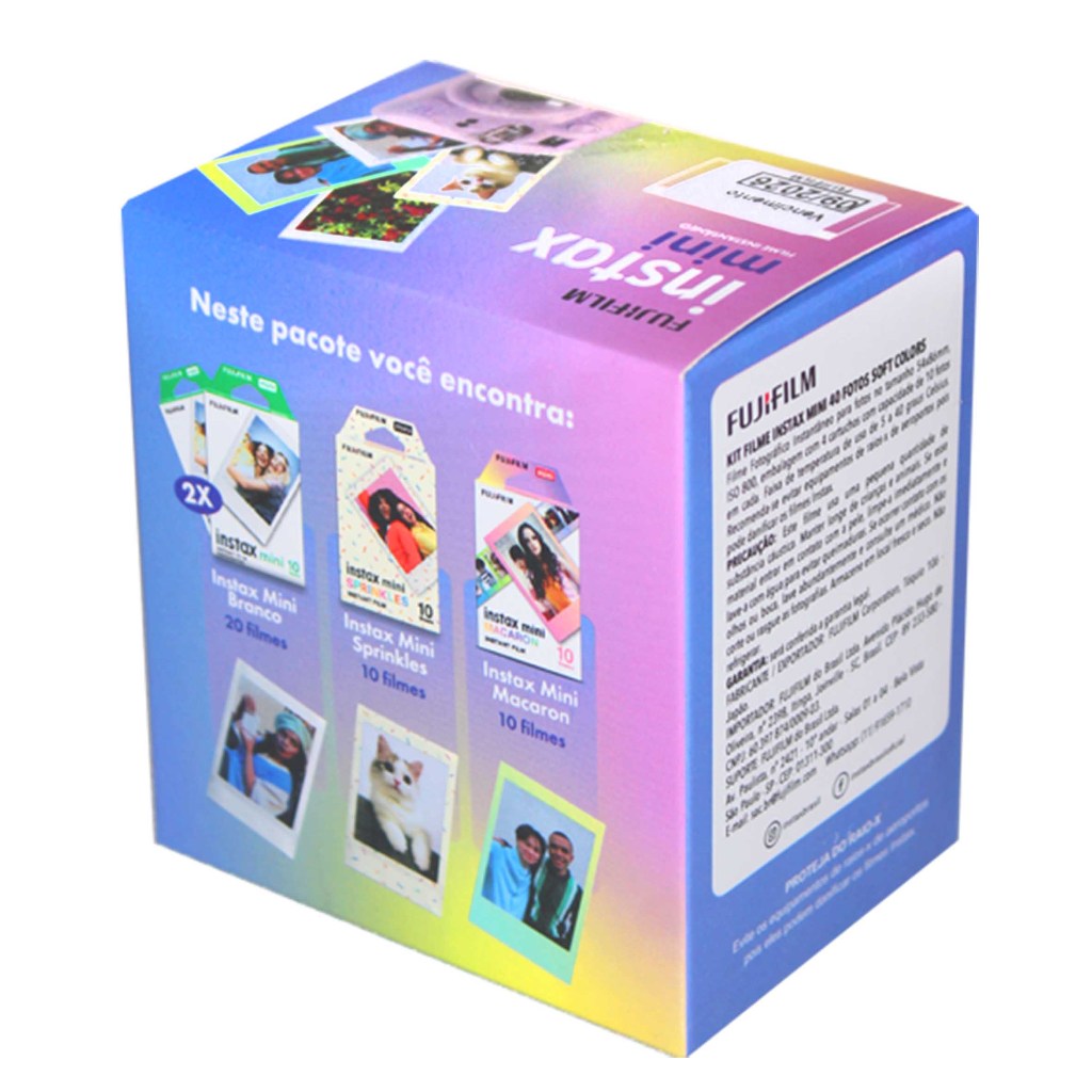 Bem vindo a ImageShop, somos distribuidor de grandes marcas a 32 anos no mercado. Compatível com as câmeras Instax Mini 50s, Mini 25, Mini 7, 8, 9, 11, 12 e com todas as impressoras Instax Mini Share , Mini Link I e II , Sp 1, Sp2 etc. Kit com 04 filmes de 10 poses cada sendo: 20 fotos moldura branca 10 fotos moldura macaron 10 fotos moldura sprinkles Garantia 3 meses O filme INSTAX MINI é adequado para todas as câmeras INSTAX MINI e é vendido em um prático cartucho. Oferece fotos instantâneas impressionantes que podem ser levadas em uma bolsa, carteira ou moldura de mini foto. O filme INSTAX garante uma reprodução nítida e clara, cores vívidas e tons de pele naturais. A nova emulsão, altamente estável, pode ser utilizada em temperaturas de 5ºC a 40ºC. RECURSOS É revelada instantaneamente - Pressione o obturador, capture o momento e veja o slide da foto desaparecer e a imagem revelada na frente dos seus olhos! ISO de alta velocidade 800 - Com qualidade granular surpreendente, o filme instax garante cores vibrantes e tons de pele naturais. Tamanho de cartão de crédito - 5,4 x 8,6 cm (tamanho do filme) - O filme de tamanho de cartão de crédito exclusivo é fácil de carregar na bolsa ou carteira e possui uma moldura branca característica que pode ser deixada assim ou você pode escrever mensagens engraçadas personalizadas. Cartucho fácil de carregar - Cada cartucho é projetado e rotulado para a obtenção de um carregamento fácil e é preenchido com 10 impressões cada um. Altamente estável - A nova emulsão pode ser utilizada em temperaturas de 5ºC a 40ºC.
