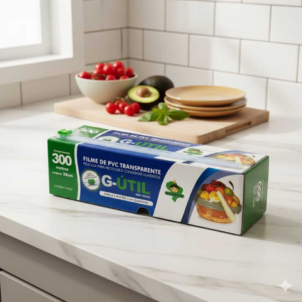 Filme PVC transparente 28cm x 300 metros, na caixa com sistema de corte fácil, película de embalagem. As instruções de uso estão na caixa. Composição: Polietileno / PVC - Material não toxico Medidas: Largura 28 cm Comprimento 300 metros Cor: Transparente Micras: 10 Não toxico, indolor, transparente, resistente e veda muito bem os alimentos. É um material que pode ser aplicado tanto para uso comercial quanto para uso doméstico. Indicações de uso: - Estética e beleza - Studio de tatuagem - Industrias em geral - Hortifrutigranjeiros - Cozinhas residenciais e Industriais - Agricultores - Açougues - Frigoríficos - Padarias - Supermercados - E outros..