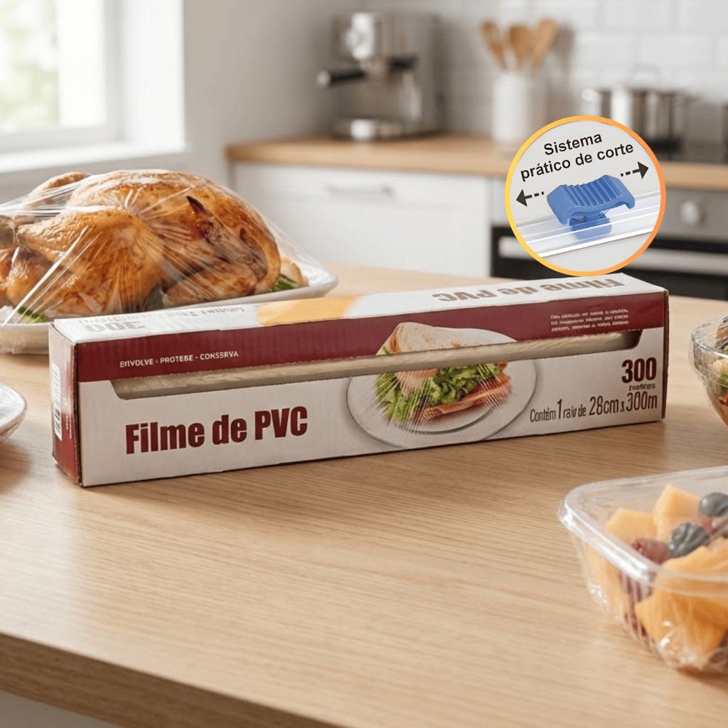 Filme PVC 300 Metros 28cm com Cortador Uso Doméstico e Profissional