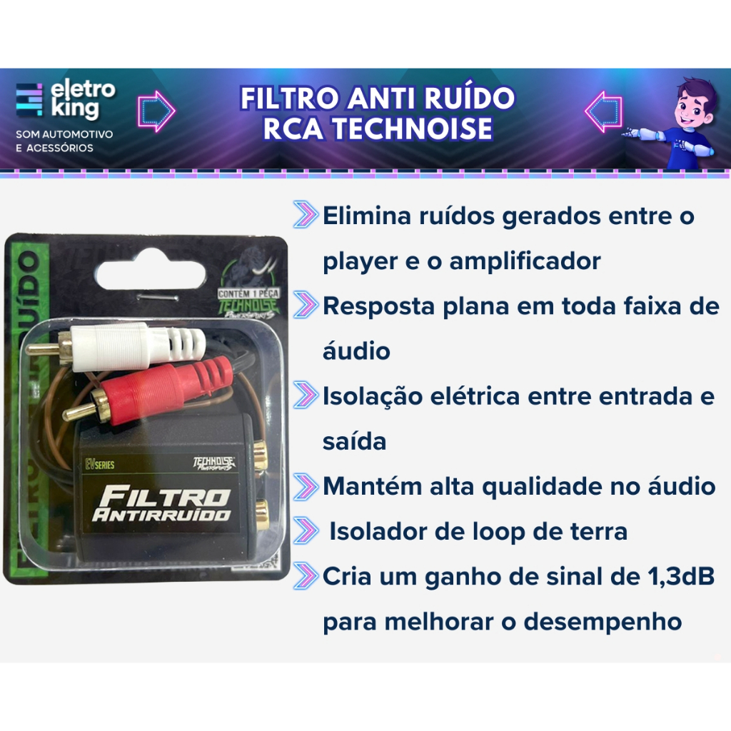 Seja bem-vindo a Eletroking, leia atentamente a descrição do produto abaixo antes da compra, qualquer dúvida, nos acione no campo de perguntas do anúncio. Filtro Anti Ruído RCA Technoise O Filtro Anti Ruído RCA Technoise, cria um ganho de sinal de 1,3dB para melhorar o desempenho e eliminar o ruído elétrico no sistema de áudio por um loop de terra. Os plugs RCA (macho) são a entrada do isolador e devem ser conectados à unidade de origem. O plug RCA vermelho é o canal direito e o plug RCA branco é o canal esquerdo. As tomadas RCA são a saída do isolador. Os fios marrons normalmente não são usados. Os fios de aterramento marrons devem ser usados apena se nenhum som for audível em ambos os canais. Conecte os fios marrons ao aterramento da unidade de origem. Especificações Técnicas: • Elimina ruídos gerados entre o player e o amplificador • Resposta plana em toda faixa de áudio • Isolação elétrica entre entrada e saída • Circuito interno blindado contra ruído • Mantém alta qualidade no áudio • Isolador de loop de terra • Cria um ganho de sinal de 1,3dB para melhorar o desempenho • Fácil Instalação Conteúdo da Embalagem: • 1 Filtro Anti Ruído RCA Technoise Importante: • Garantia de 90 Dias. • Valor da Unidade. • Todos os Nossos Produtos São Novos, Originais e Acompanham Nota Fiscal. • A Eletroking recomenda que a instalação seja feita por profissional especializado e não se responsabiliza pelo mau uso do produto.