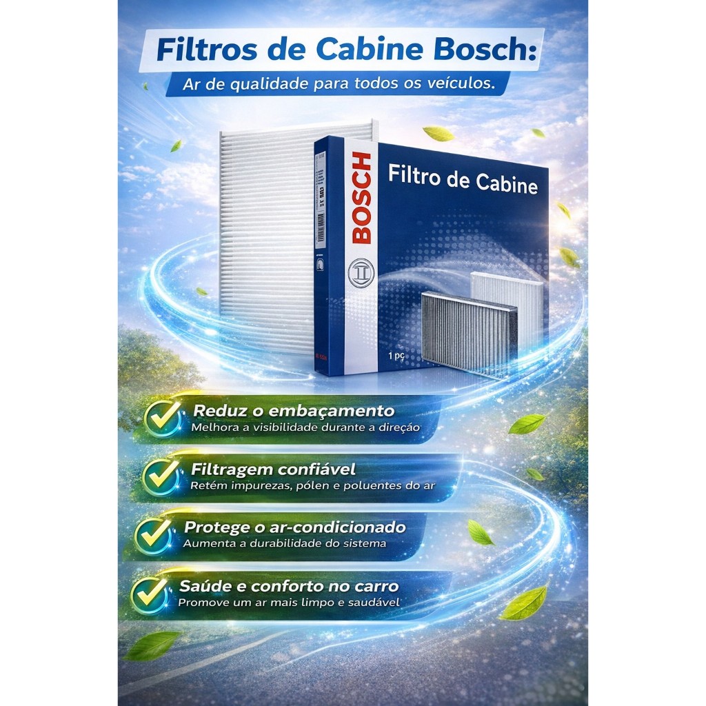 01 - FILTRO DE AR CONDICIONADO BOSCH OU WEGA 0986BF0592 + ORBI-AIR LIMPA AR CONDICIONADO (HIGIENIZADOR) Cabine / Anti-Pólen • Aplicação: • Nissan March — 2011 a 2016 • Nissan Versa — 2011 a 2016 • Os filtros de cabine Bosch absorvem até 100% das substâncias nocivas presentes no ar que circula dentro do veículo, como amianto, pólen, pó, fuligem e bactérias, garantindo ar limpo e livre de impurezas. Além disso, protegem também o veículo, pois reduzem a contaminação nos componentes e dutos de ar, como ventiladores, sistemas de calefação, painel e para-brisa • Higienizador Orbi-air - Promove a limpeza interna do sistema de ar-condicionado automotivo - Válvula especial que possibilita fácil aplicação e rápida liberação do veiculo proporcionado cheiro de carro novo Filtro Bosch - Eficaz na filtragem do ar que vai para o interior do veículo - Maior resistência à umidade e formação de micro-organismos - Aplicações desenvolvidas especialmente para cada veículo • Caso não encontre seu veiculo na caixa de seleção, nos manda uma pergunta, que te indicaremos o filtro para seu veiculo! • NÃO COMPRAR SEM ANTES TIRAS TODAS AS DÚVIDAS, CERTIFIQUE-SE QUE ESTÁ COMPRANDO O PRODUTO CORRETO PARA A APLICAÇÃO DESEJADA! • Recomendamos sempre que toda e qualquer instalação seja realizada por profissionais especializados para evitar problemas futuros, pois não somos responsáveis pela má instalação ou mau uso do produto.